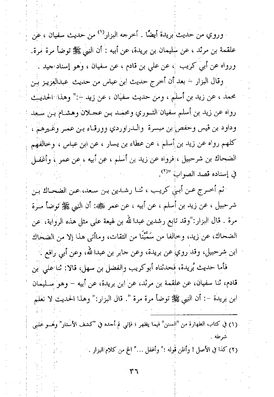 فأما حديث بريدة، فحدثناه أبو كريب والفضل بن سهل، قالا: ثنا علي بن قادم، ثنا سفيان، عن علقمة بن مرثد، عن ابن بريدة، عن أبيه – وهو سليمان بن بريدة –: أن النبي صلى الله عليه وسلم توضأ مرة مرة ". قال البزار: "وهذا الحديث لا نعلم