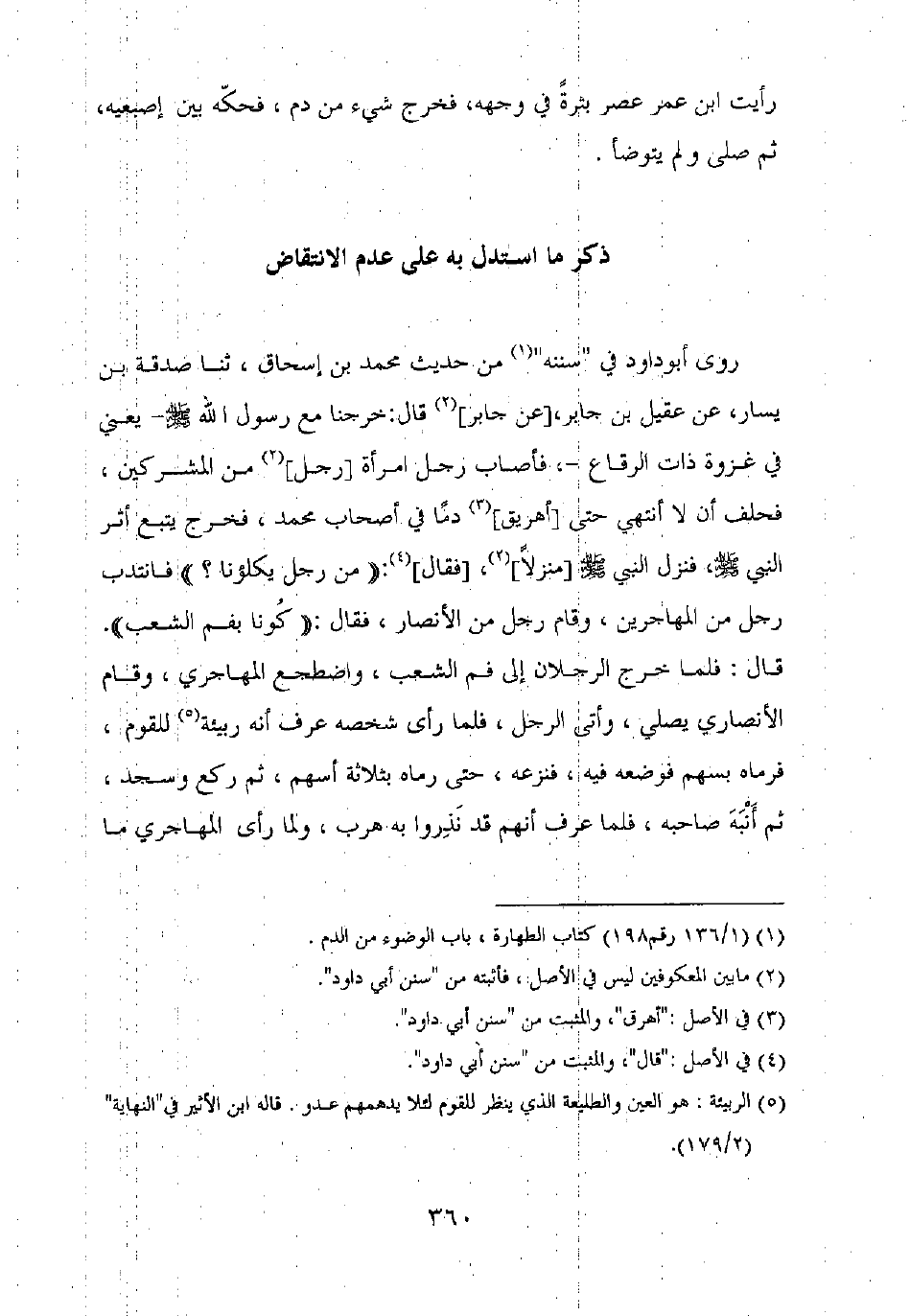 رأيت ابن عمر عصر بثرة في وجهه، فخرج شيء من دم، فحكه بين إصبعيه، ثم صلى ولم يتوضأ.