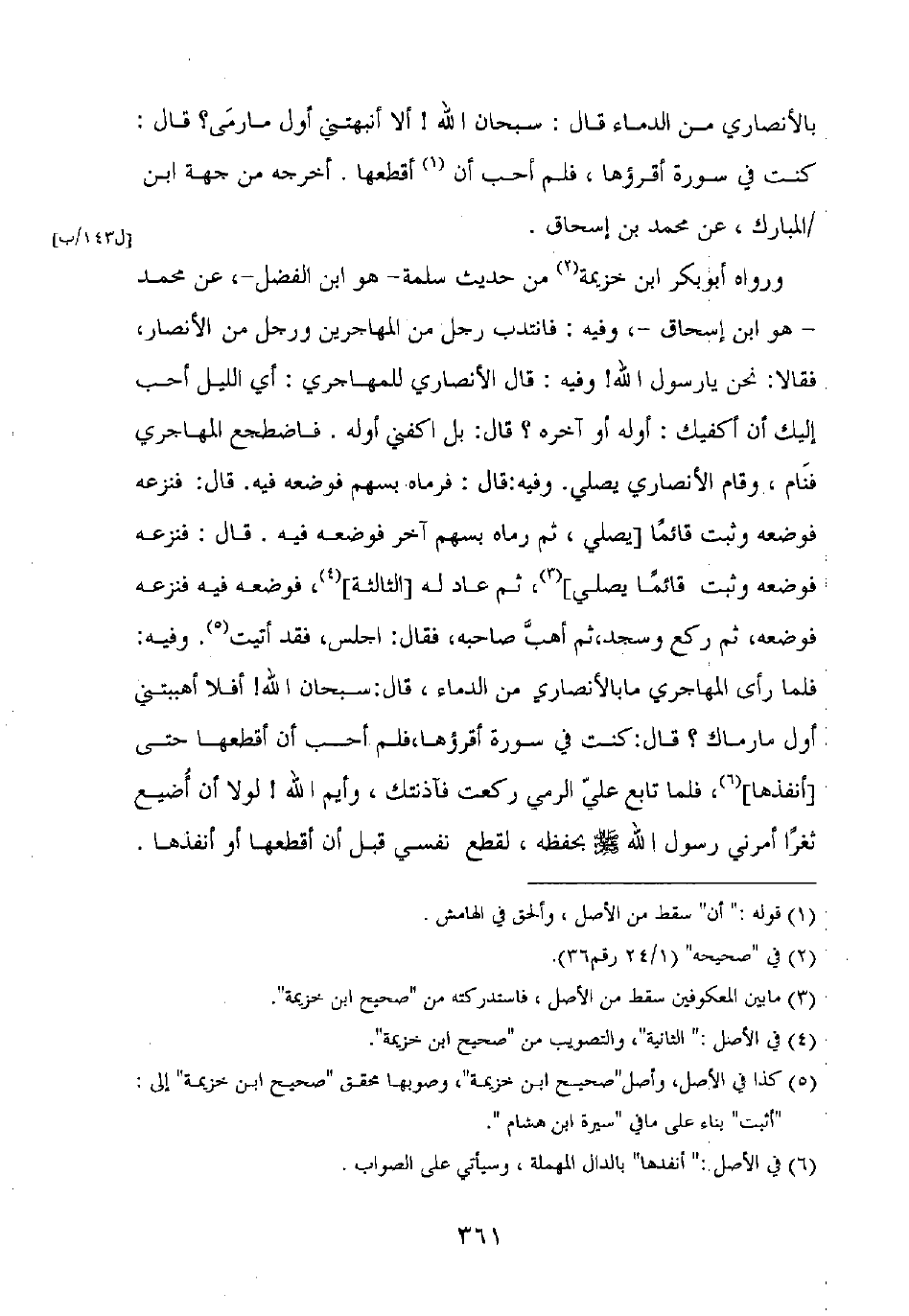 ورواه أبو بكر بن خزيمة من حديث سلمة – هو ابن الفضل –، عن محمد – هو ابن إسحاق –، وفيه: فانتدب رجل من المهاجرين ورجل من الأنصار، فقالا: نحن يا رسول الله! وفيه: قال الأنصاري للمهاجري: أي الليل أحب إليك أن أكفيك: أوله أو آخره؟ قال: بل اكفني أوله. فاضطجع المهاجري فنام، وقام الأنصاري يصلي. وفيه: قال فرماه بسهم فوضعه فيه. قال: فنزعه فوضعه وثبت قائما [يصلي، ثم رماه بسهم آخر فوضعه فيه. قال: فنزعه فوضعه وثبت قائما يصلي]، ثم عاد له [الثالثة]، فوضعه فيه فنزعه فوضعه، ثم ركع وسجد، ثم أهب صاحبه، فقال: اجلس، فقد أتيت. وفيه: فلما رأى المهاجري ما بالأنصاري من الدماء، قال: سبحان الله! أفلا أهببتني أول ما رماك؟ قال: كنت في سورة أقرؤها، فلم أحب ان أقطعها حتى [أنفذها]، فلما تابع علي الرمي ركعت فآذنتك، وأيم الله! لولا أن أضيع ثغرا أمرني رسول الله صلى الله عليه وسلم بحفظه، لقطع نفسي قبل أن أقطعها أو أنفذها.