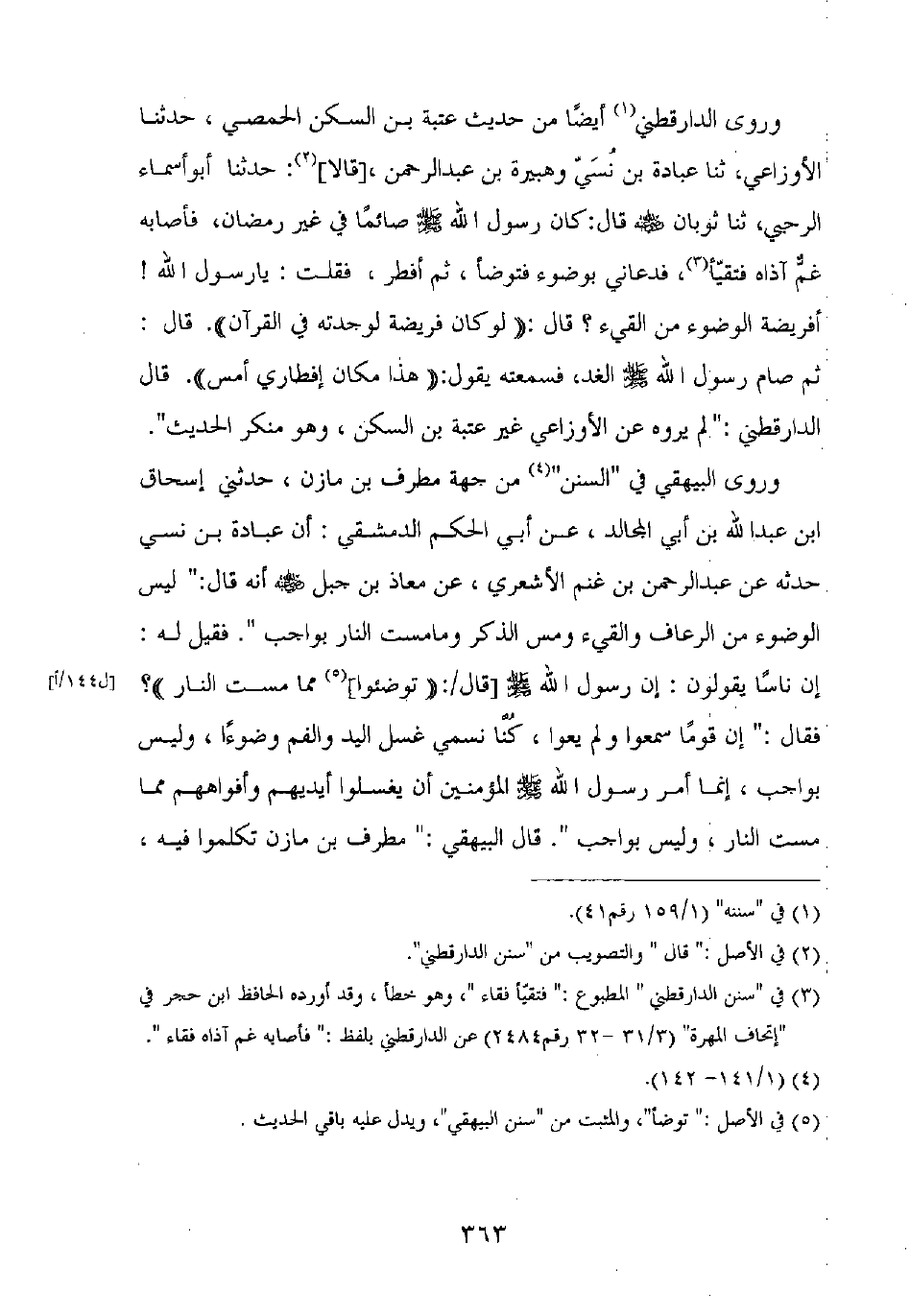 وروى البيهقي في "السنن" من جهة مطرف بن مازن، حدثني إسحاق بن عبد الله بن أبي المجالد، عن أبي الحكم الدمشقي: أن عبادة بن نسي حدثه عن عبد الرحمن بن غنم الأشعري، عن معاذ بن جبل رضي الله عنه أنه قال: "ليس الوضوء من الرعاف والقئ ومس الذكر وما مست النار بواجب". فقيل له: إن ناسا يقولون: إن رسول الله صلى الله عليه وسلم [قال: "توضئوا] " مما مست النار"؟ فقال: "إن قوما سمعوا ولم يعوا، كنا نسمي غسل اليد والفم وضوءا، وليس بواجب، إنما أمر رسول الله صلى الله عليه وسلم المؤمنين أن يغسلوا أيديهم وأفواههم مما مست النار، وليس بواجب". قال البيهقي: "مطرف بن مازن تكلموا فيه،