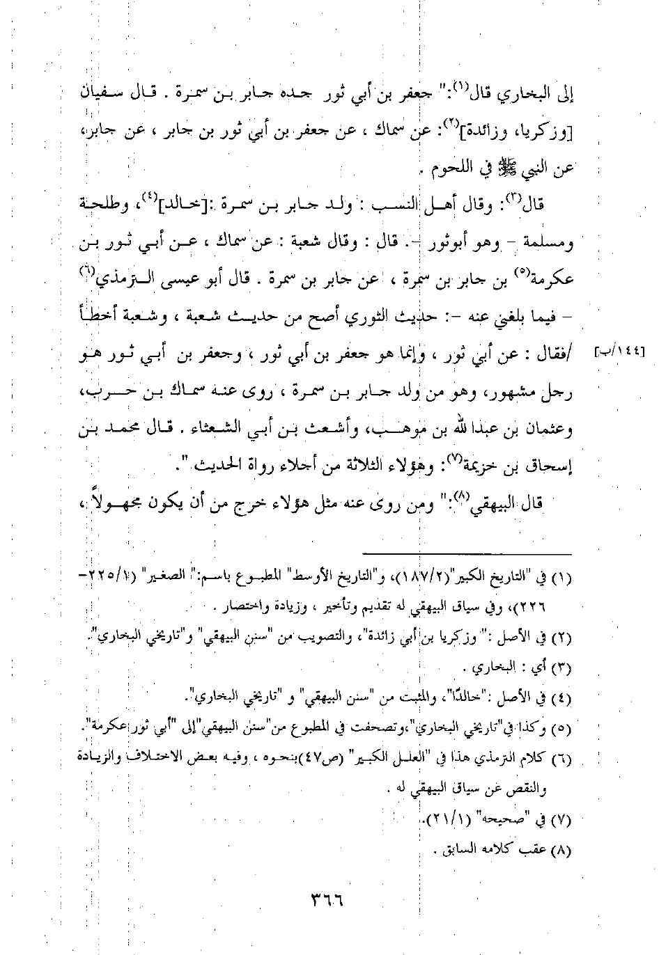 إلى البخاري قال: "جعفر بن أبي ثور جده جابر بن سمرة. قال سفيان [وزكريا، وزائدة]: عن سماك، عن جعفر بن أبي ثور بن جابر، عن جابر، عن النبي صلى الله عليه وسلم في اللحوم.