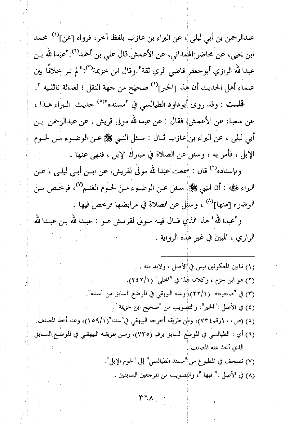 قلت: وقد روى أبو داود الطيالسي في "مسنده" حديث البراء هذا، عن شعبة، عن الأعمش، فقال: عن عبد الله مولى قريش، عن عبد الرحمن بن أبي ليلى، عن البراء بن عازب قال: سئل النبي صلى الله عليه وسلم عن الوضوء من لحوم الإبل، فأمر به، وسئل عن الصلاة في مبارك الإبل، فنهى عنها.