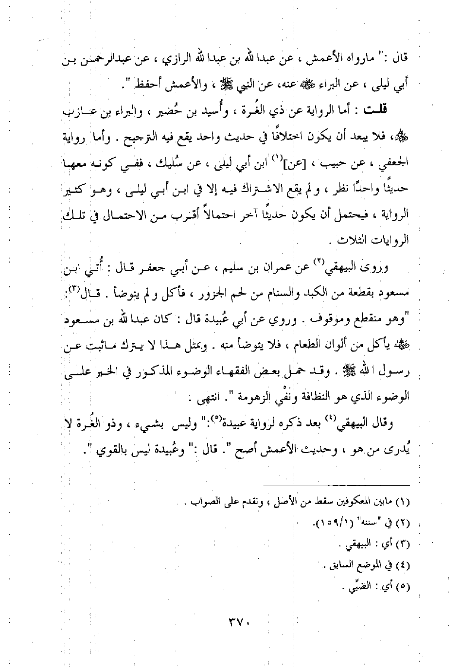 وروى البيهقي عن عمران بن سليم، عن أبي جعفر قال: أتي ابن مسعود بقطعة من الكبد والسنام من لحم الجزور، فأكل ولم يتوضأ. قال: "وهو منقطع وموقوف. وروي عن أبي عبيدة قال: كان عبد الله بن مسعود رضي الله عنه يأكل من ألوان الطعام، فلا يتوضأ منه. وبمثل هذا لا يترك ما ثبت عن رسول الله صلى الله عليه وسلم. وقد حمل بعض الفقهاء الوضوء المذكور في الخبر على الوضوء الذي هو النظافة ونفي الزهومة". انتهى.