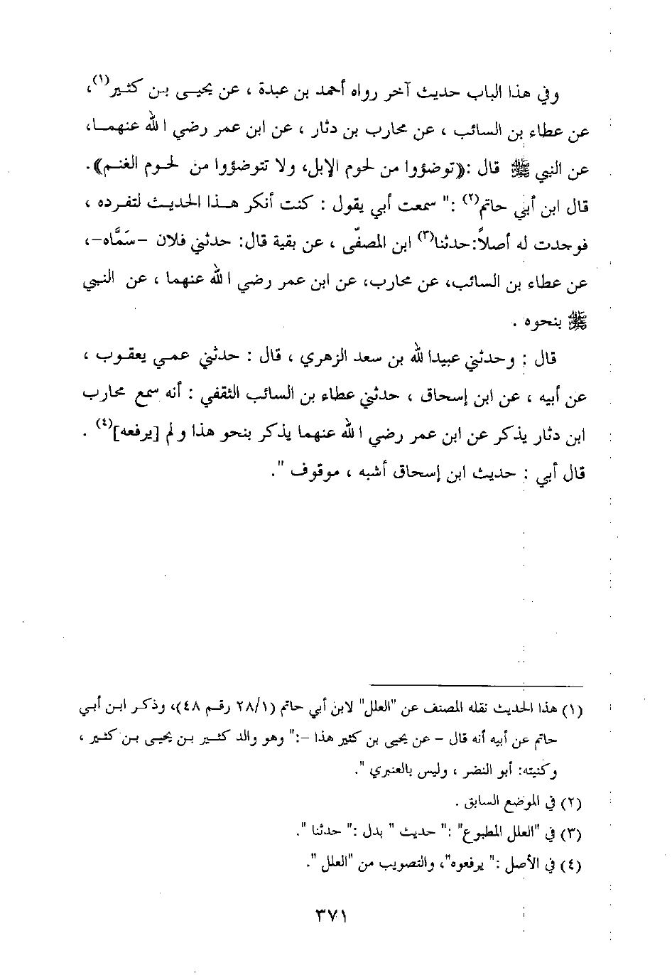 قال ابن أبي حاتم: "سمعت أبي يقول: كنت أنكر هذا الحديث لتفرده، فوجدت له أصلا: حدثنا ابن المصفى، عن بقية قال: حدثني فلان – سماه –، عن عطاء بن السائب، عن محارب، عن ابن عمر رضي الله عنهما، عن النبي صلى الله عليه وسلم بنحوه.