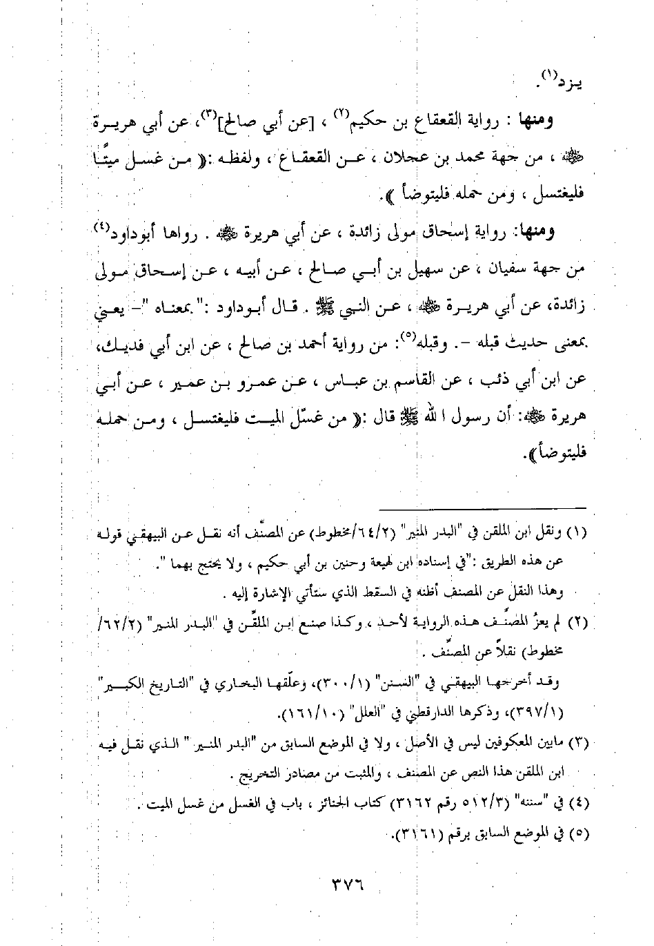 ومنها: رواية إسحاق مولى زائدة، عن أبي هريرة رضي الله عنه. رواها أبو داود من جهة سفيان، عن سهيل بن أبي صالح، عن أبيه، عن إسحاق مولى زائدة، عن أبي هريرة رضي الله عنه، عن النبي صلى الله عليه وسلم. قال أبو داود: "بمعناه" – يعني بمعنى حديث قبله –. وقبله: من رواية أحمد بن صالح، عن ابن أبي فديك، عن ابن أبي ذئب، عن القاسم بن عباس، عن عمرو بن عمير، عن أبي هريرة رضي الله عنه: أن رسول الله صلى الله عليه وسلم قال: "من غسل الميت فليغتسل، ومن حمله فليتوضأ".
