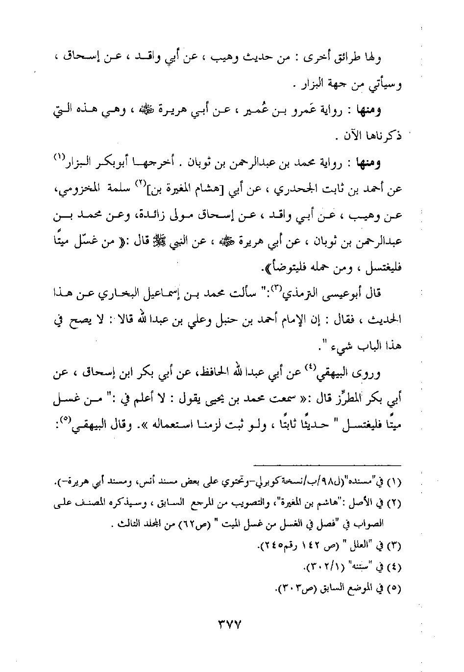 ومنها: رواية محمد بن عبد الرحمن بن ثوبان، أخرجها أبو بكر البزار عن أحمد بن ثابت الجحدري، عن أبي [هشام المغيرة بن] سلمة المخزومي، عن وهيب، عن أبي واقد، عن إسحاق مولى زائدة، وعن محمد بن عبد الرحمن بن ثوبان، عن أبي هريرة رضي الله عنه، عن النبي صلى الله عليه وسلم قال: "من غسل ميتا فليغتسل، ومن حمله فليتوضأ".