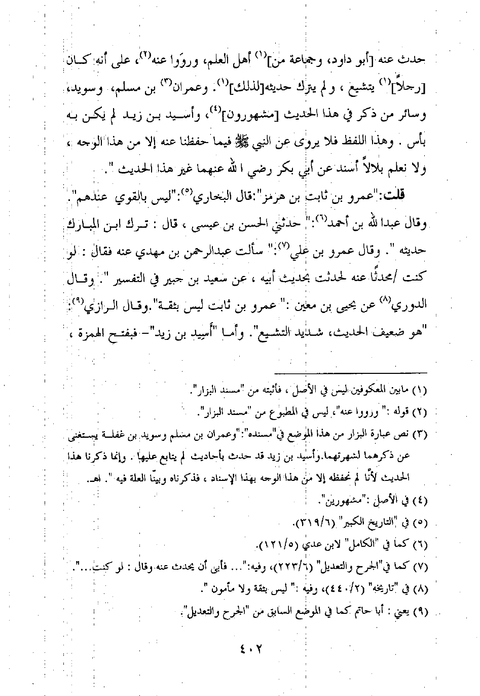 وقال عبد الله بن أحمد: "حدثني الحسن بن عيسى، قال: ترك ابن المبارك حديثه". وقال عمرو بن علي: "سألت عبد الرحمن بن مهدي عنه فقال: لو كنت محدثا عنه لحدثت بحديث أبيه، عن سعيد بن جبير في التفسير". وقال الدوري عن يحيى بن معين: "عمرو بن ثابت ليس بثقة". وقال الرازي: "هو ضعيف الحديث، شديد التشيع". وأما "أسيد بن زيد" – فبفتح الهمزة،