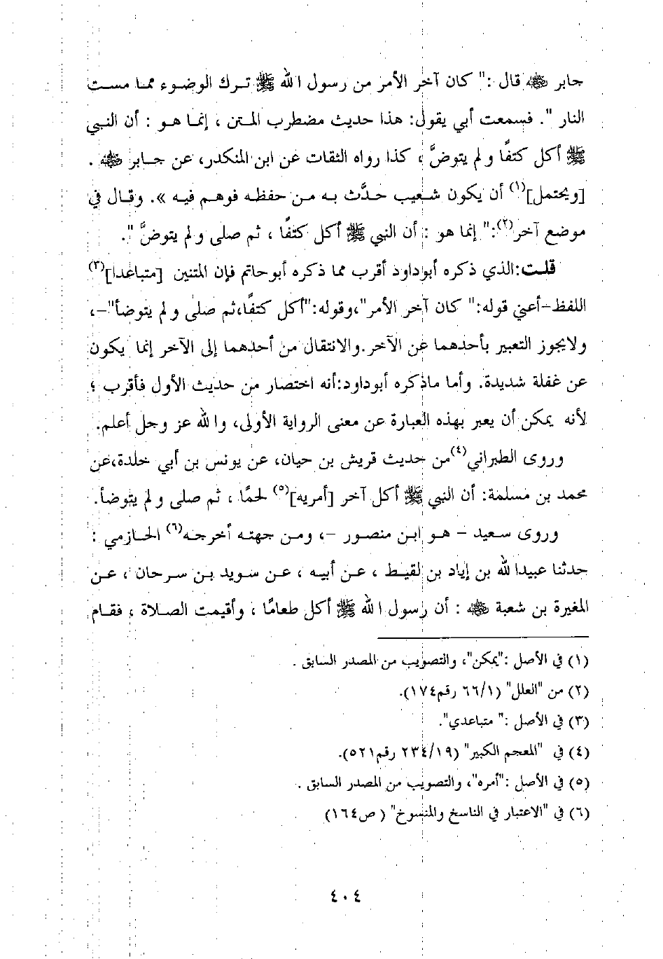 جابر رضي الله عنه قال: "كان آخر الأمر من رسول الله صلى الله عليه وسلم ترك الوضوء مما مست النار". فسمعت أبي يقول: هذا حديث مضطرب المتن، إنما هو: أن النبي صلى الله عليه وسلم أكل كتفا ولم يتوض، كذا رواه الثقات عن ابن المنكدر، عن جابر رضي الله عنه.