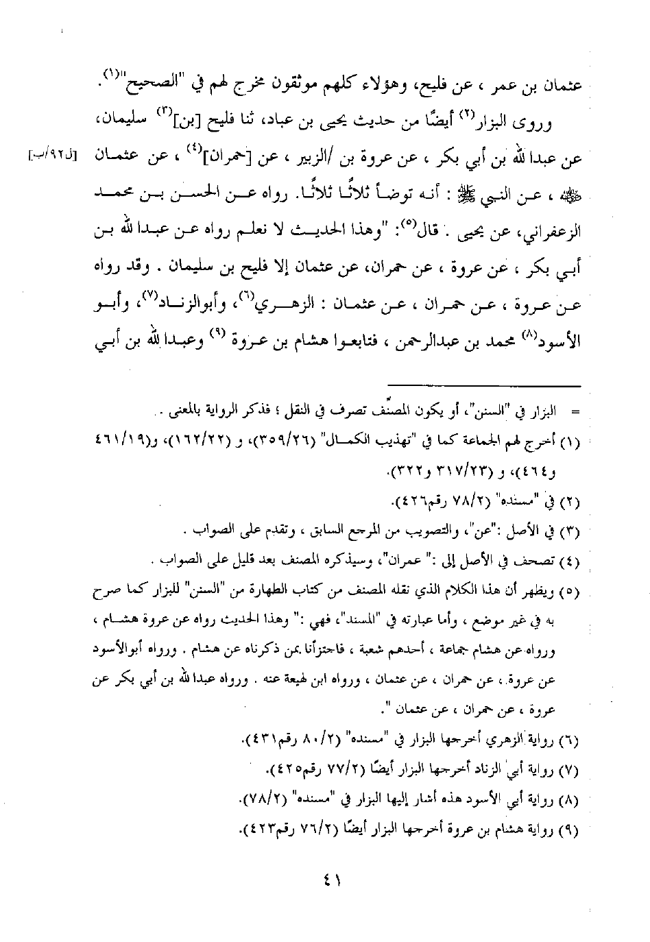 وروى البزار أيضا من حديث يحيى بن عباد، ثنا فليح [بن] سليمان، عن عبد الله بن أبي بكر، عن عروة بن الزبير، عن [حمران]، عن عثمان رضي الله عنه، عن النبي صلى الله عليه وسلم: أنه توضأ ثلاثا ثلاثا. رواه عن الحسن بن محمد الزعفراني، عن يحيى. قال: "وهذا الحديث لا نعلم رواه عن عبد الله بن أبي بكر، عن عروة، عن حمران، عن عثمان إلا فليح بن سليمان. وقد رواه عن عروة، عن حمران، عن عثمان: الزهري، وأبو الزناد، وأبو الأسود محمد بن عبد الرحمن، فتابعوا هشام بن عروة وعبد الله بن أبي