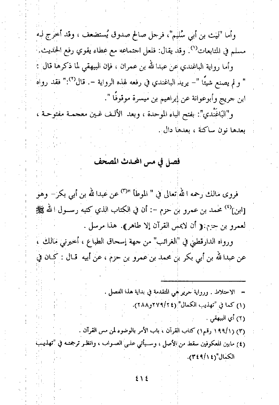 فروى مالك رحمه الله تعالى في "الموطأ" عن عبد الله بن أبي بكر – وهو [ابن] محمد بن عمرو بن حزم –: أن في الكتاب الذي كتبه رسول الله صلى الله عليه وسلم لعمرو بن حزم: "أن لا يمس القرآن إلا طاهر". هذا مرسل.