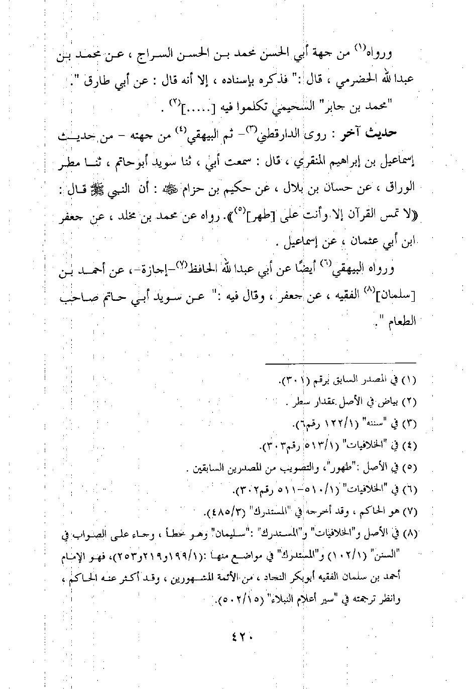 حديث آخر: روى الدارقطني – ثم البيهقي من جهته – من حديث إسماعيل بن إبراهيم المنقري، قال: سمعت أبي، ثنا سويد أبو حاتم، ثنا مطر الوراق، عن حسان بن بلال، عن حكيم بن حزام رضي الله عنه: أن النبي صلى الله عليه وسلم قال: "لا تمس القرآن إلا وأنت على [طهر] ". رواه عن محمد بن مخلد، عن جعفر بن أبي عثمان، عن إسماعيل.