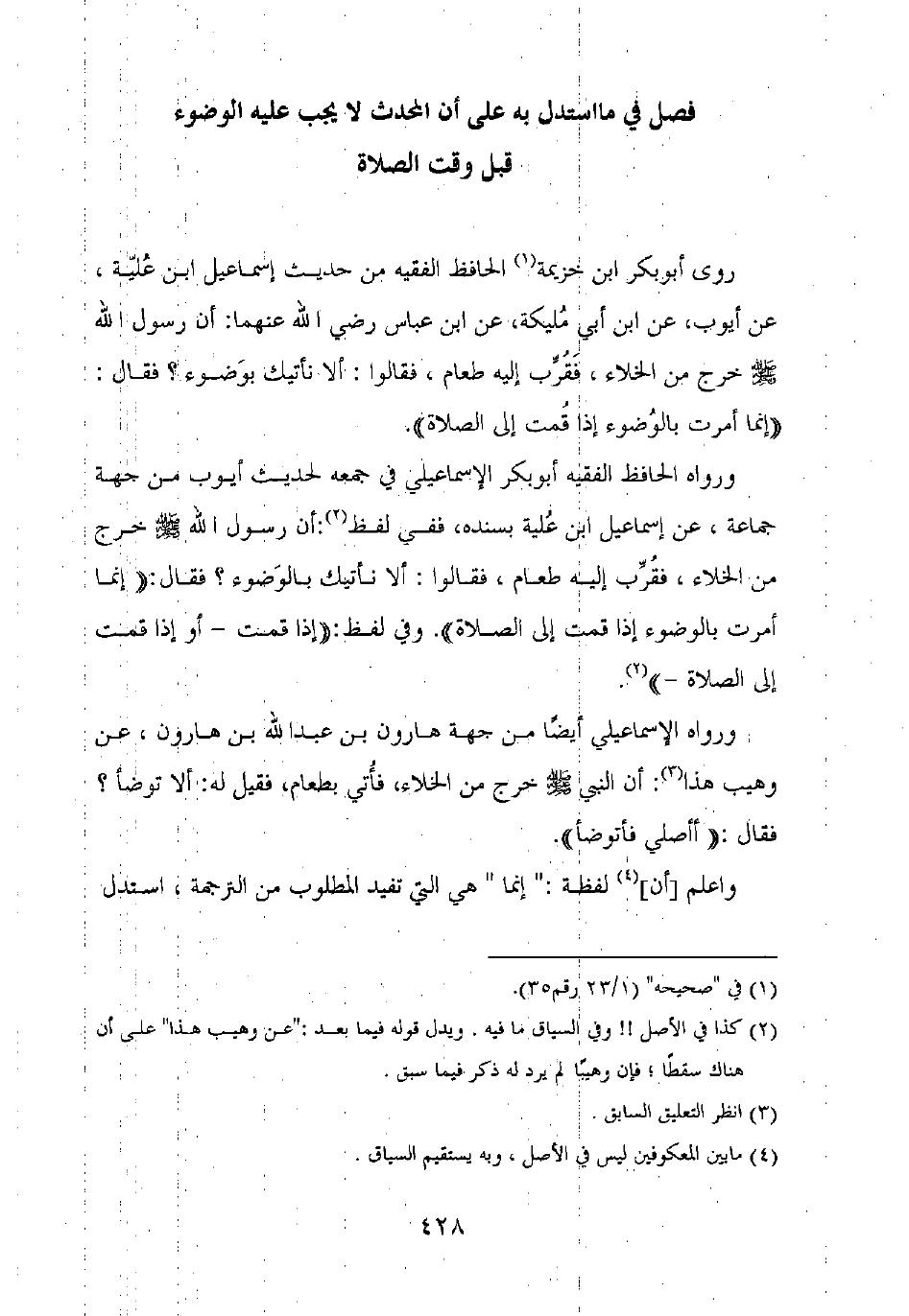 ورواه الحافظ الفقيه أبو بكر الإسماعيلي في جمعه لحديث أيوب من جهة جماعة، عن إسماعيل بن علية بسنده، ففي لفظ: أن رسول الله صلى الله عليه وسلم خرج من الخلاء، فقرب إليه طعام، فقالوا: ألا نأتيك بالوضوء؟ فقال: "إنما أمرت بالوضوء إذا قمت إلى الصلاة". وفي لفظ: "إذا قمت – أو إذا قمت إلى الصلاة -".