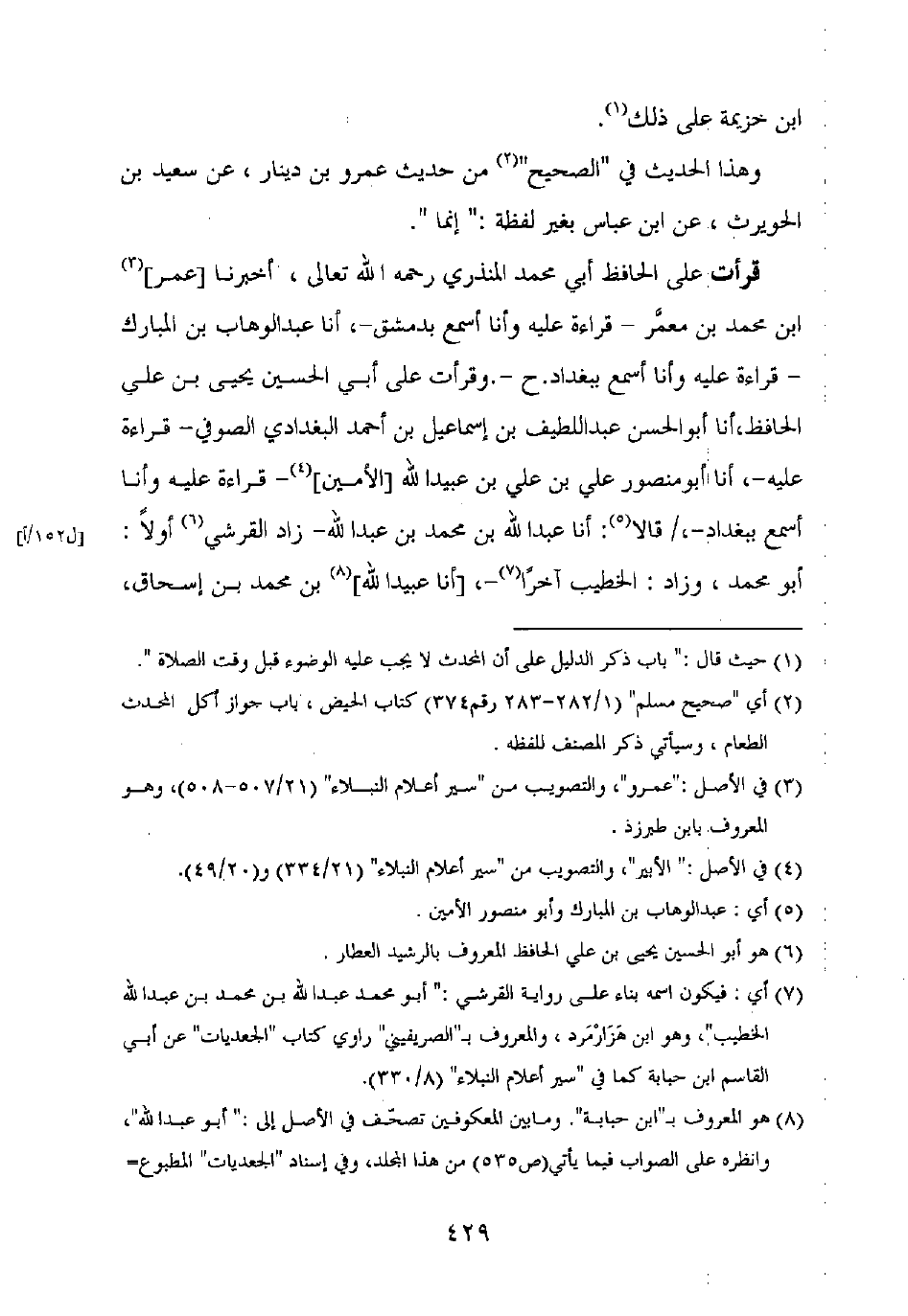 قرأت على الحافظ أبي محمد المنذري رحمه الله تعالى، أخبرنا [عمر] بن محمد بن معمر – قراءة عليه وأنا أسمع بدمشق –، أنا عبد الوهاب بن المبارك – قراءة عليه وأنا أسمع ببغداد. ح – وقرأت على أبي الحسين يحيى بن علي الحافظ، أنا أبو الحسن عبد اللطيف بن إسماعيل بن أحمد البغدادي الصوفي – قراءة عليه –، أنا أبو منصور علي بن علي بن عبيد الله [الأمين] – قراءة عليه وأنا أسمع ببغداد –، قالا: أنا عبد الله بن محمد بن عبد الله – زاد القرشي أولا: أبو محمد، وزاد: الخطيب آخرا –، [أنا عبيد الله] بن محمد بن إسحاق،