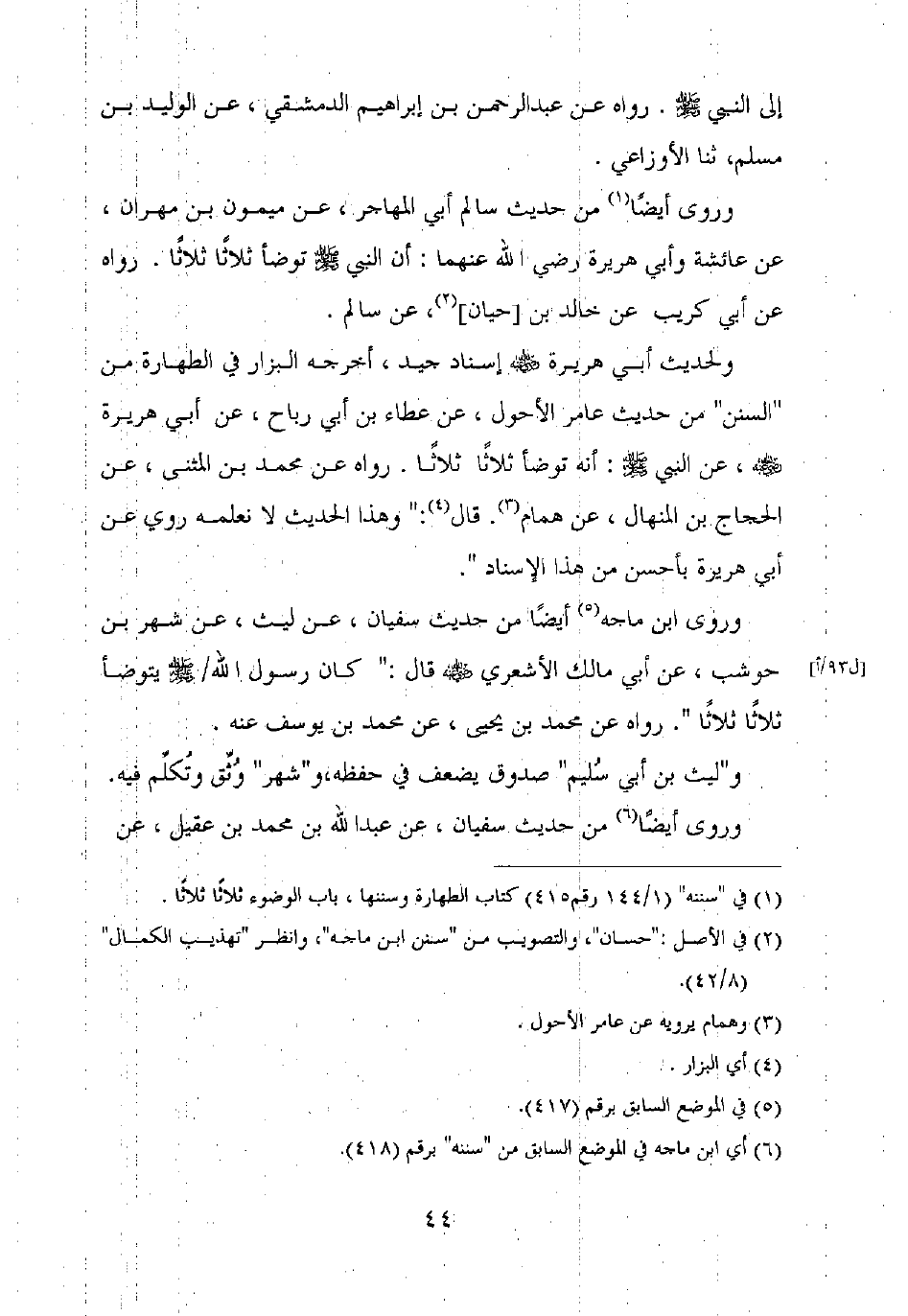 وروى ابن ماجة أيضا من حديث سفيان، عن ليث، عن شهر بن حوشب، عن أبي مالك الأشعري رضي الله عنه قال: "كان رسول الله صلى الله عليه وسلم يتوضأ ثلاثا ثلاثا". رواه عن محمد بن يحيى، عن محمد بن يوسف عنه.