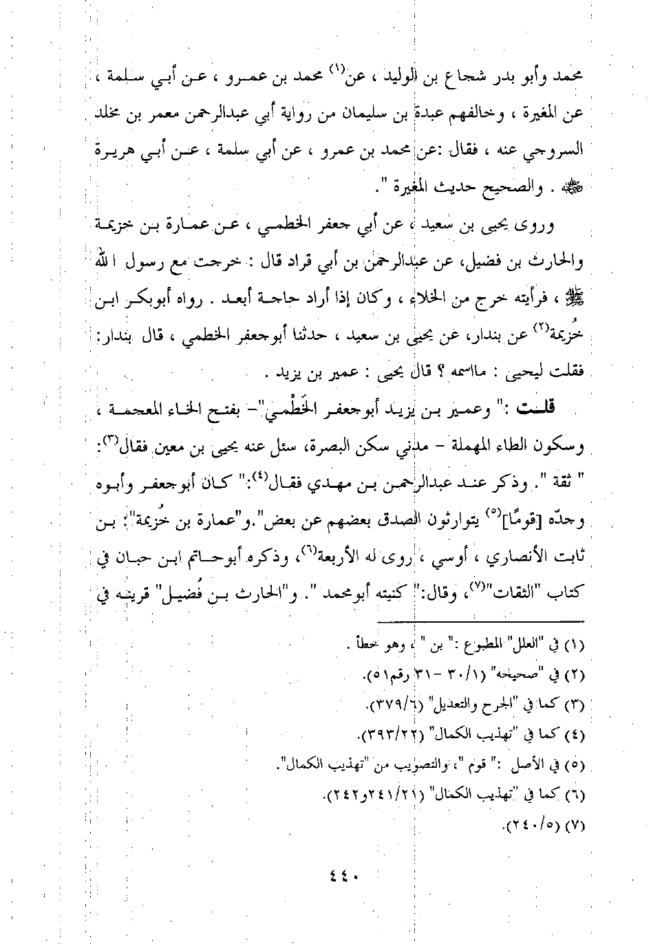 قلت: "وعمير بن يزيد أبو جعفر الخطمي" – بفتح الخاء المعجمة، وسكون الطاء المهملة – مدني سكن البصرة، سئل عنه يحيى بن معين فقال: "ثقة". وذكر عند عبد الرحمن بن مهدي فقال: "كان أبو جعفر وأبوه وجده [قوما] يتوارثون الصدق بعضهم عن بعض". و"عمارة بن خزيمة": بن ثابت الأنصاري، أوسي، روى له الأربعة، وذكره أبو حاتم ابن حبان في كتاب "الثقات"، وقال: "كنيته أبو محمد ". و"الحارث بن فضيل" قرينه في