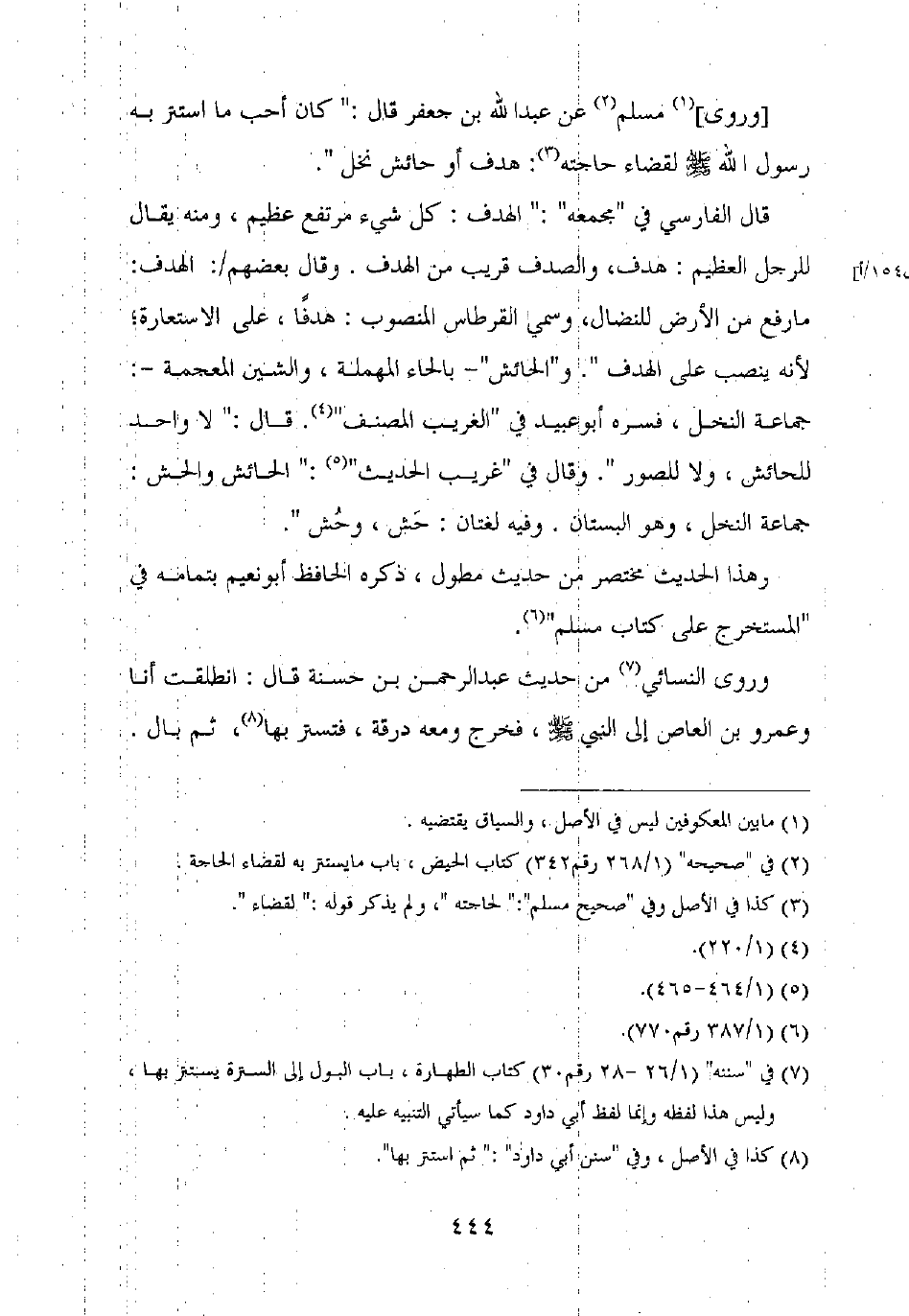 [وروى] مسلم عن عبد الله بن جعفر قال: "كان أحب ما استتر به رسول الله صلى الله عليه وسلم لقضاء حاجته: هدف أو حائش نخل".