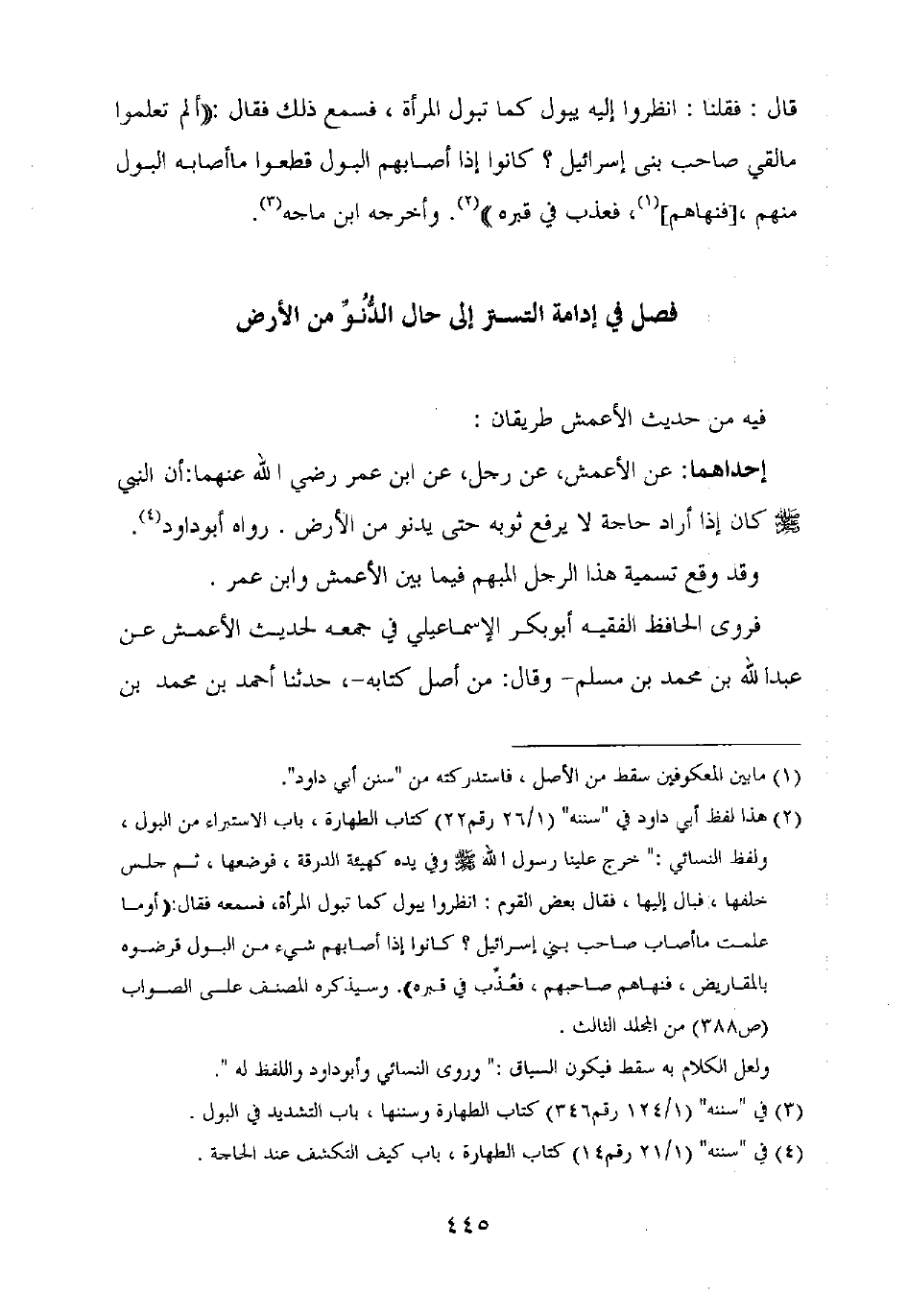قال: فقلنا: انظروا إليه يبول كما تبول المرأة، فسمع ذلك فقال: "ألم تعلموا ما لقي صاحب بني إسرائيل؟ كانوا إذا أصابهم البول قطعوا ما أصابه البول منهم، [فنهاهم]، فعذب في قبره". وأخرجه ابن ماجة.