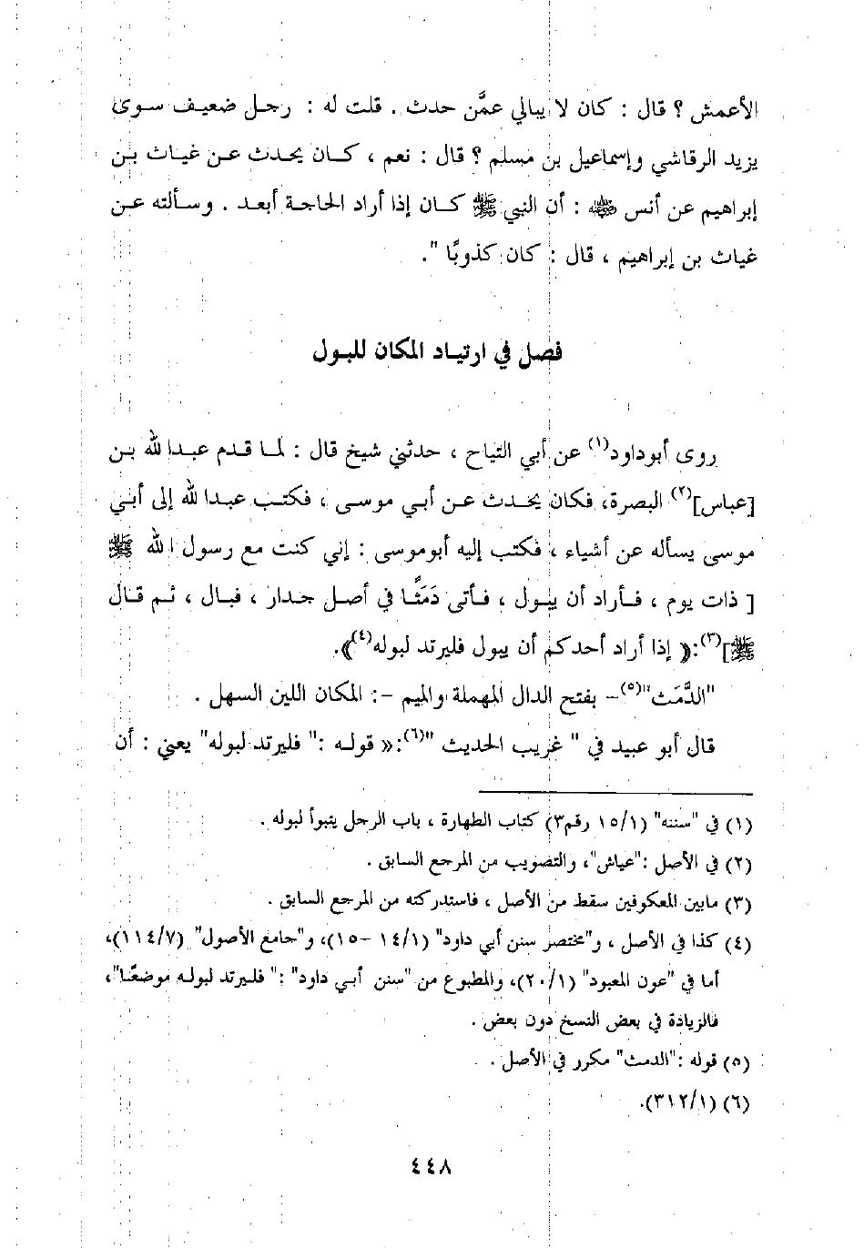 روى أبو داود عن أبي التياح، حدثني شيخ قال: لما قدم عبد الله بن [عباس] البصرة، فكان يحدث عن أبي موسى، فكتب عبد الله إلى أبي موسى يسأله عن أشياء، فكتب إليه أبو موسى: إني كنت مع رسول الله صلى الله عليه وسلم [ذات يوم، فأراد أن يبول، فأتى دمثا في أصل جدار، فبال، ثم قال صلى الله عليه وسلم]: "إذا أراد أحدكم أن يبول فليرتد لبوله".