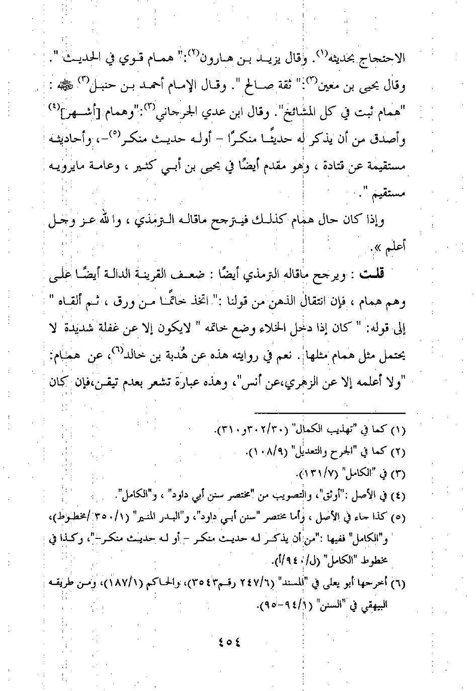 قلت: ويرجح ما قاله الترمذي أيضا: ضعف القرينة الدالة أيضا على وهم همام، فإن انتقال الذهن من قولنا: "اتخذ خاتما من ورق، ثم ألقاه" إلى قوله: "كان إذا دخل الخلاء وضع خاتمه" لا يكون إلا عن غفلة شديدة لا يحتمل مثل همام مثلها. نعم في روايته هذه عن هدبة بن خالد، عن همام: "ولا أعلمه إلا عن الزهري، عن أنس"، وهذا عبارة تشعر بعدم تيقن، فإن كان