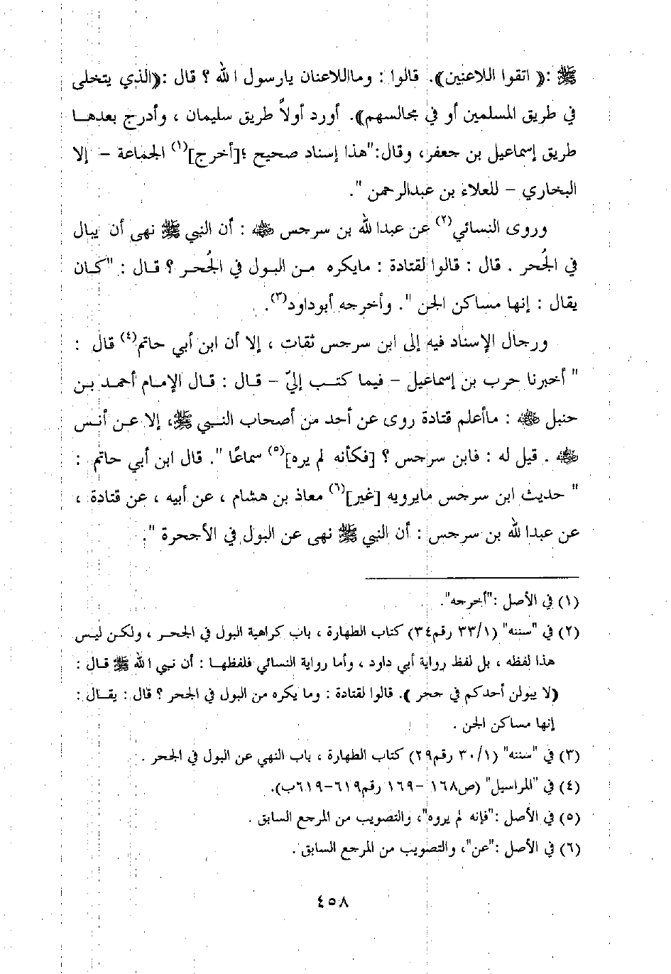 ورجال الإسناد فيه إلى ابن سرجس ثقات، إلا أن ابن أبي حاتم قال: "أخبرنا حرب بن إسماعيل – فيما كتب إلي – قال: قال الإمام أحمد بن حنبل رضي الله عنه: ما أعلم قتادة روى عن أحد من أصحاب النبي صلى الله عليه وسلم إلا عن أنس رضي الله عنه. قيل له: فابن سرجس؟ [فكأنه لم يره] سماعا". قال ابن أبي حاتم: "حديث ابن سرجس ما يرويه [غير] معاذ بن هشام، عن أبيه، عن قتادة، عن عبد الله بن سرجس: أن النبي صلى الله عليه وسلم نهى عن البول في الأجحرة".