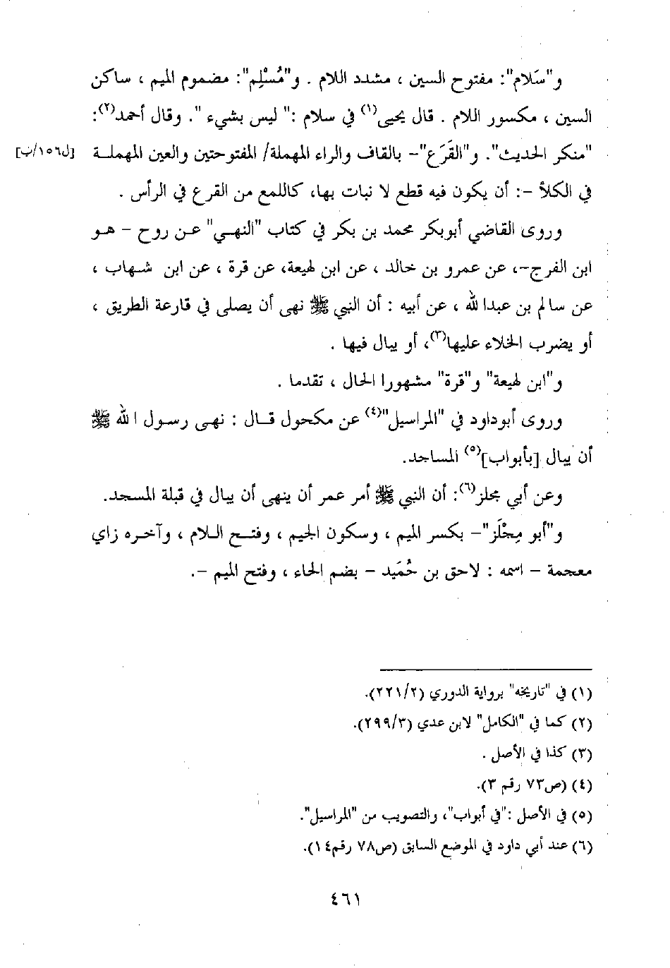 و"سلام": مفتوح السين، مشدد اللام. و"مسلم": مضموم الميم، ساكن السين، مكسور اللام. قال يحيى في سلام: "ليس بشيء". وقال أحمد: "منكر الحديث". و"القرع" – بالقاف والراء المهملة المفتوحتين والعين المهملة في الكلأ –: أن يكون فيه قطع لا نبات بها، كاللمع من القرع في الرأس.