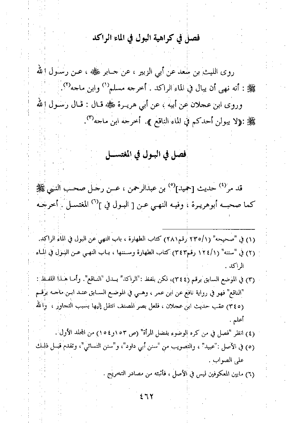روى الليث بن سعد عن أبي الزبير، عن جابر رضي الله عنه، عن رسول الله صلى الله عليه وسلم: أنه نهى أن يبال في الماء الراكد. أخرجه مسلم وابن ماجة.