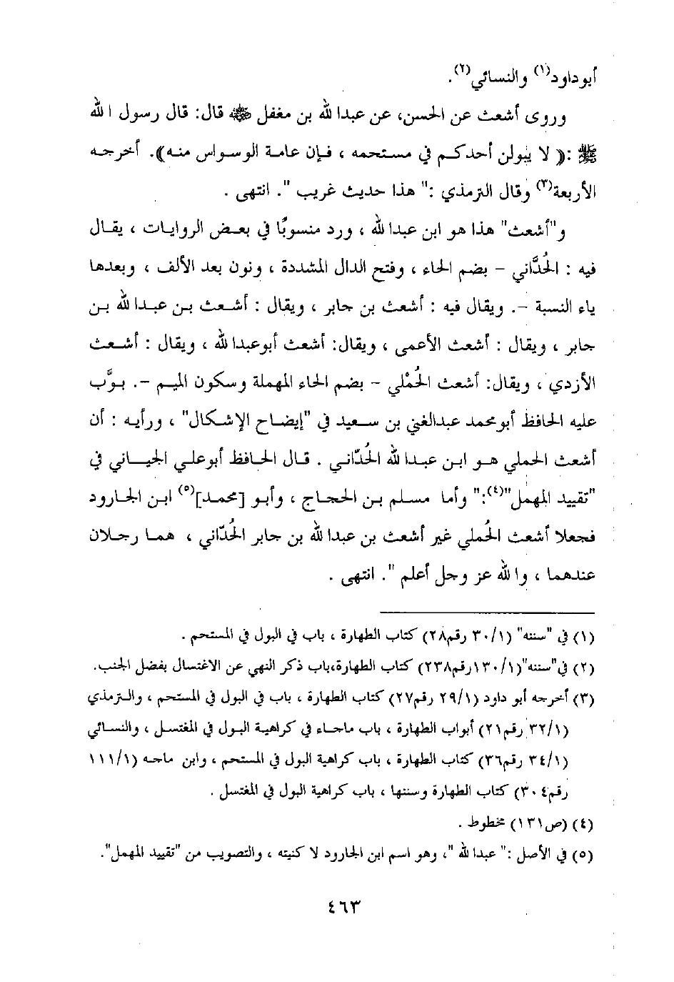 وروى أشعث عن الحسن، عن عبد الله بن مغفل رضي الله عنه قال: قال رسول الله صلى الله عليه وسلم: "لا يبولن أحدكم في مستحمه، فإن عامة الوسواس منه". أخرجه الأربعة وقال الترمذي: "هذا حديث غريب". انتهى.