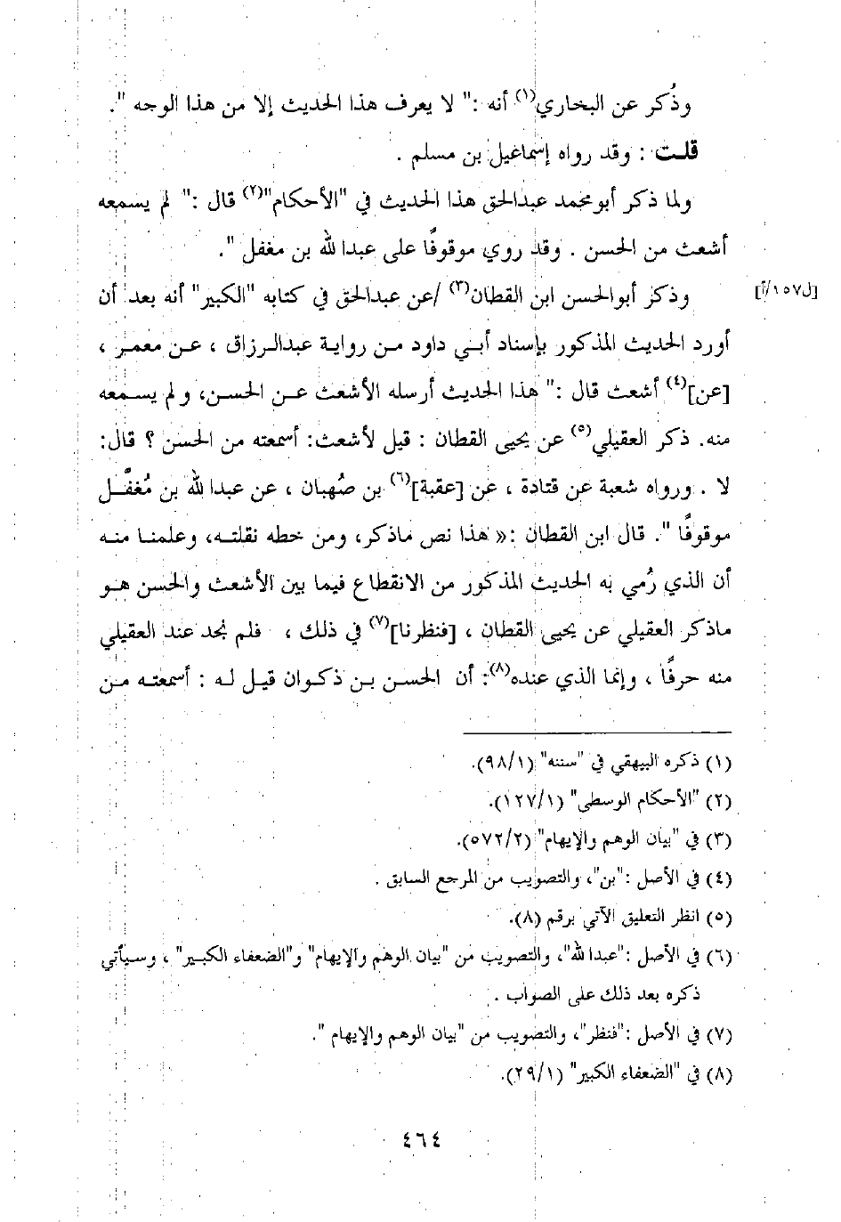 وذكر أبو الحسن ابن القطان عن عبد الحق في كتابه "الكبير" أنه بعد أن أورد الحديث المذكور بإسناد أبي داود من رواية عبد الرزاق، عن معمر، [عن] أشعث قال: "هذا الحديث أرسله الأشعث عن الحسن، ولم يسمعه منه. ذكر العقيلي عن يحيى القطان: قيل لأشعث: أسمعته من الحسن؟ قال: لا. ورواه شعبة عن قتادة، عن [عقبة] بن صهبان، عن عبد الله بن مغفل موقوفا". قال ابن القطان: "هذا نص ما ذكر، ومن خطه نقلته، وعلمنا منه أن الذي رمي به الحديث المذكور من الانقطاع في ما بين الأشعث والحسن هو ما ذكر العقيلي عن يحيى القطان، [فنظرنا] في ذلك، فلم نجد عند العقيلي منه حرفا. وإنما الذي عنده: أن الحسن بن ذكوان قيل له: أسمعته من
