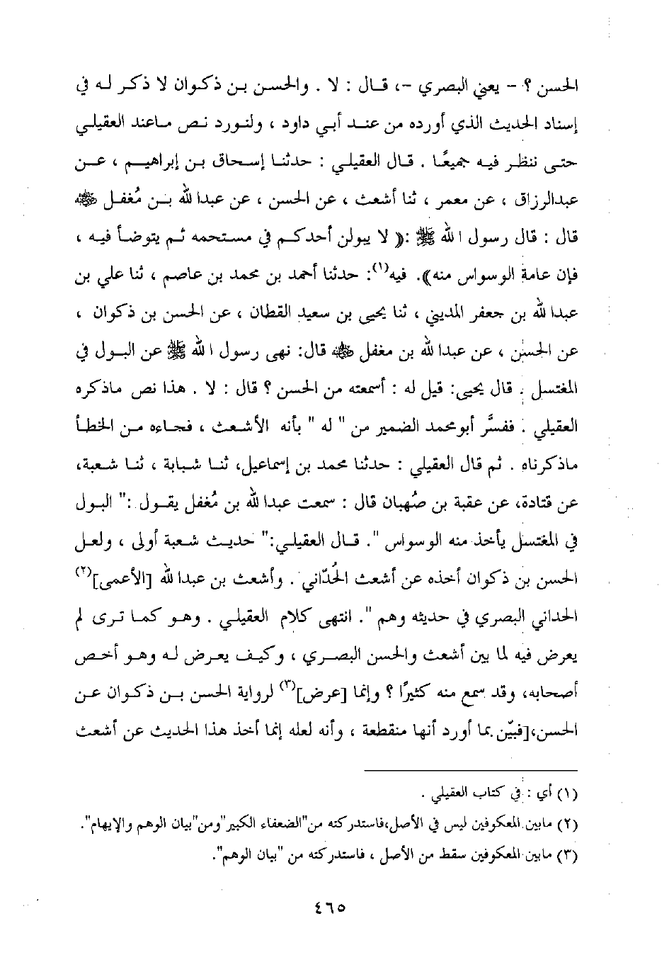 الحسن؟ - يعني البصري –، قال: لا. والحسن بن ذكوان لا ذكر له في إسناد الحديث الذي أورده من عند أبي داود، ولنورد نص ما عند العقيلي حتى ننظر فيه جميعا. قال العقيلي: حدثنا إسحاق بن إبراهيم، عن عبد الرزاق، عن معمر، ثنا أشعث، عن الحسن، عن عبد الله بن مغفل رضي الله عنه قال: قال رسول الله صلى الله عليه وسلم: "لا يبولن أحدكم في مستحمه ثم يتوضأ فيه، فإن عامة الوسواس منه". فيه: حدثنا أحمد بن محمد بن عاصم، ثنا علي بن عبد الله بن جعفر المديني، ثنا يحيى بن سعيد القطان، عن الحسن بن ذكوان، عن الحسن، عن عبد الله بن مغفل رضي الله عنه قال: نهى رسول الله صلى الله عليه وسلم عن البول في المغتسل. قال يحيى: قيل له: أسمعته من الحسن؟ قال: لا. هذا نص ما ذكره العقيلي. ففسر أبو محمد الضمير من "له" بأنه الأشعث، فجاءه من الخطأ ما ذكرناه. ثم قال العقيلي: حدثنا محمد بن إسماعيل، ثنا شبابة، ثنا شعبة، عن قتادة، عن عقبة بن صهبان قال: سمعت عبد الله بن مغفل يقول: "البول في المغتسل يأخذ منه الوسواس". قال العقيلي: "حديث شعبة أولى، ولعل الحسن بن ذكوان أخذه عن أشعث الحداني. وأشعث بن عبد الله [الأعمى] الحداني البصري في حديثه وهم ". انتهى كلام العقيلي. وهو كما ترى لم يعرض فيه لما بين أشعث والحسن البصري، وكيف يعرض له وهو كما ترى لم يعرض فيه لما بين أشعث والحسن البصري، وكيف يعرض له وهو أخص أصحابه، وقد سمع منه كثيرا؟ وإنما [عرض] لرواية الحسن بن ذكوان عن الحسن، [فبين بما أورد أنها منقطعة، وأنه لعله إنما أخذ هذا الحديث عن أشعث