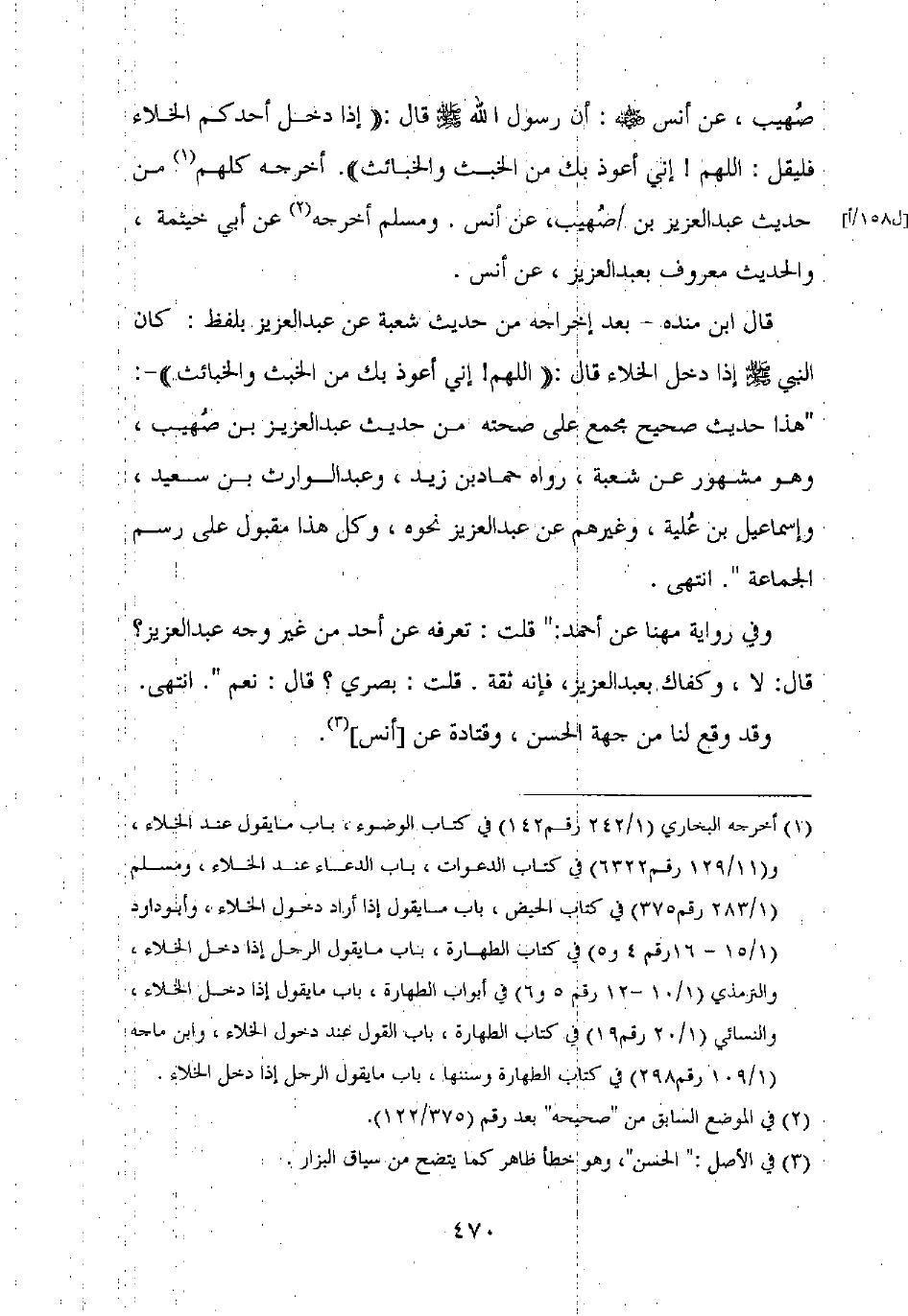 صهيب، عن أنس رضي الله عنه: أن رسول الله صلى الله عليه وسلم قال: "إذا دخل أحدكم الخلاء فليقل: اللهم! إني أعوذ بك من الخبث والخبائث". أخرجه كلهم من حديث عبد العزيز بن صهيب، عن أنس. ومسلم أخرجه عن أبي خيثمة، والحديث معروف بعبد العزيز، عن أنس.