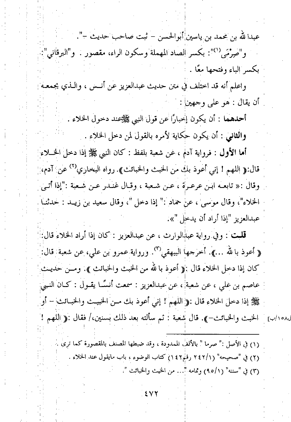 أما الأول: فرواية آدم، عن شعبة بلفظ: كان النبي صلى الله عليه وسلم إذا دخل الخلاء قال: "اللهم! إني أعوذ بك من الخبث والخبائث". رواه البخاري عن آدم، وقال: "تابعه ابن عرعرة، عن شعبة، وقال غندر عن شعبة: "إذا أتى الخلاء"، وقال موسى، عن حماد: "إذا دخل"، وقال سعيد بن زيد: حدثنا عبد العزيز "إذا أراد أن يدخل" ".