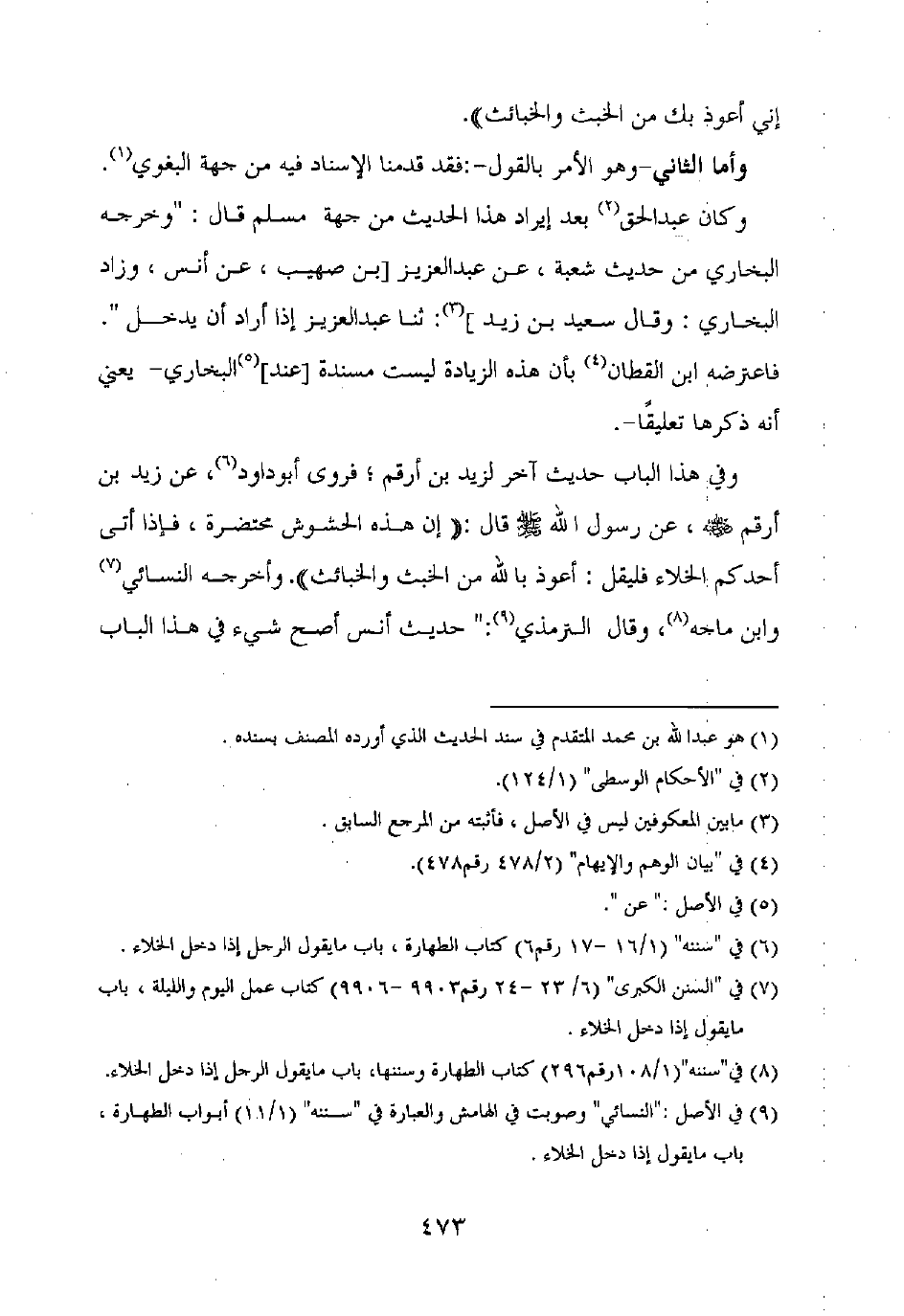 وفي هذا الباب حديث آخر لزيد بن أرقم، فروى أبو داود، عن زيد بن أرقم رضي الله عنه، عن رسول الله صلى الله عليه وسلم قال: "إن هذه الحشوش محتضرة، فإذا أتى أحدكم الخلاء فليقل: أعوذ بالله من الخبث والخبائث". وأخرجه النسائي وابن ماجة، وقال الترمذي: "حديث أنس أصح شيء في هذا الباب