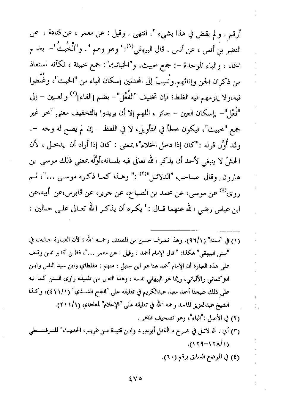 أرقم. ولم يقض في هذا بشيء". انتهى. وقيل: عن معمر، عن قتادة، عن النضر بن أنس، عن أنس. قال البيهقي: "وهم وهم". و"الخبث" – بضم الخاء، والباء الموحدة –: جمع خبيث. و"الخبائث": جمع خبيثة، فكأنه استعاذ من ذكران الجن وإناثهم. ونسب إلى المحدثين إسكان الباء من "الخبث"، وغلطوا فيه، ولا يلزمهم فيه الغلط، فإن تخفيف "الفعل" – بضم [الفاء] والعين - إلى "فعل" – بإسكان العين – جائز، اللهم إلا أن يريدوا بالتخفيف معنى آخر غير جمع "خبيث"، فيكون خطأ في التأويل، لا في اللفظ – إن لم يصح له وجه.