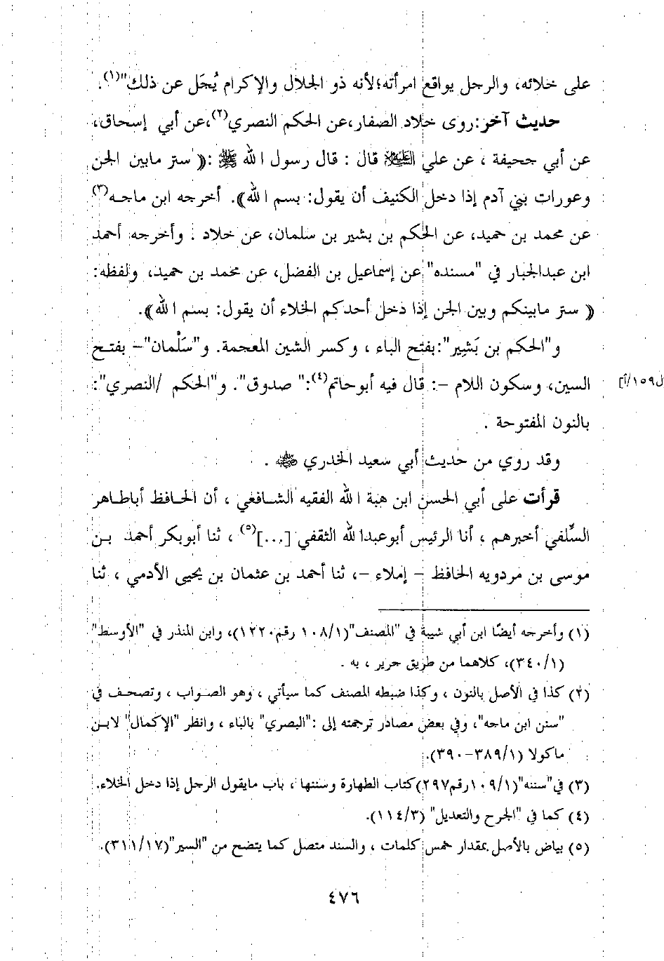 حديث آخر: روى خلاد الصفار، عن الحكم النصري، عن أبي إسحاق، عن أبي جحيفة، عن علي عليه السلام قال: قال رسول الله صلى الله عليه وسلم: "ستر ما بين الجن وعورات بني آدم إذا دخل الكنيف أن يقول: بسم الله". أخرجه ابن ماجه عن محمد بن حميد، عن الحكم بن بشير بن سلمان، عن خلاد. وأخرجه أحمد بن عبد الجبار في "مسنده" عن إسماعيل بن الفضل، عن محمد بن حميد، ولفظه: "ستر ما بينكم وبين الجن إذا دخل أحدكم الخلاء أن يقول: بسم الله".