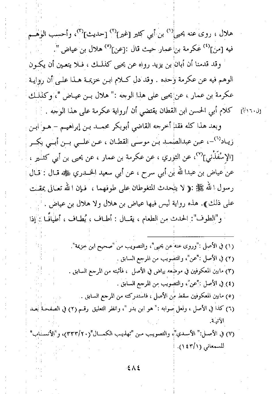 وبعد هذا كله فقد أخرجه القاضي أبو بكر محمد بن إبراهيم – هو ابن زياد –، عن عبد الصمد بن موسى القطان، عن علي بن أبي بكر [الإسفذني]، عن الثوري، عن عكرمة بن عمار، عن يحيى بن أبي كثير، عن عياض بن عبد الله بن أبي سرح، عن أبي سعيد الخدري رضي الله عنه قال: قال رسول الله صلى الله عليه وسلم: "لا يتحدث المتغوطان على طوفهما، فإن الله تعالى يمقت على ذلك". هذه رواية ليس فيها عياض بن هلال ولا هلال بن عياض.