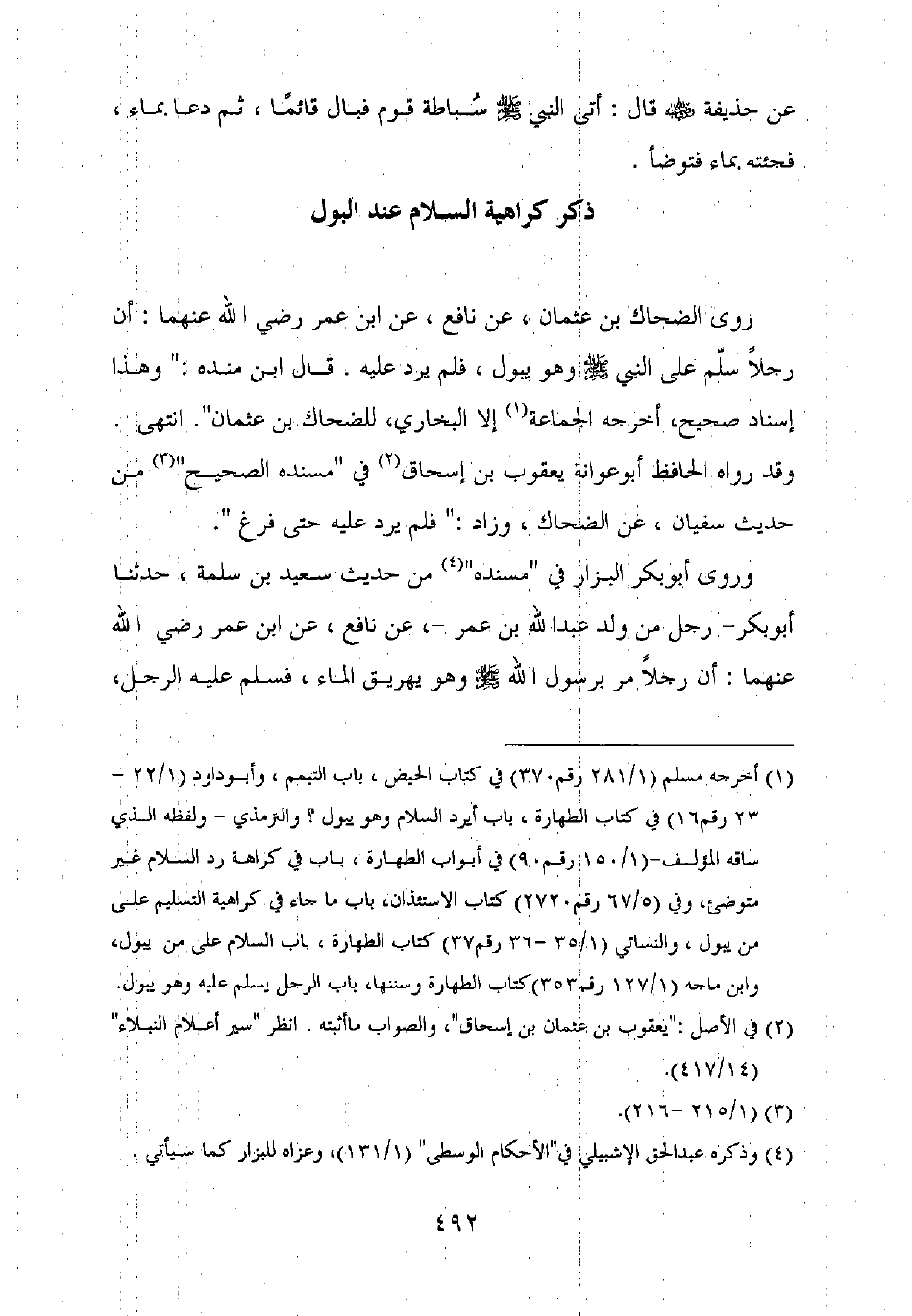 روى الضحاك بن عثمان، عن نافع، عن ابن عمر رضي الله عنهما: أن رجلا سلم على النبي صلى الله عليه وسلم وهو يبول، فلم يرد عليه. قال ابن منده: "وهذا إسناد صحيح، أخرجه الجماعة إلا البخاري، للضحاك بن عثمان". انتهى.