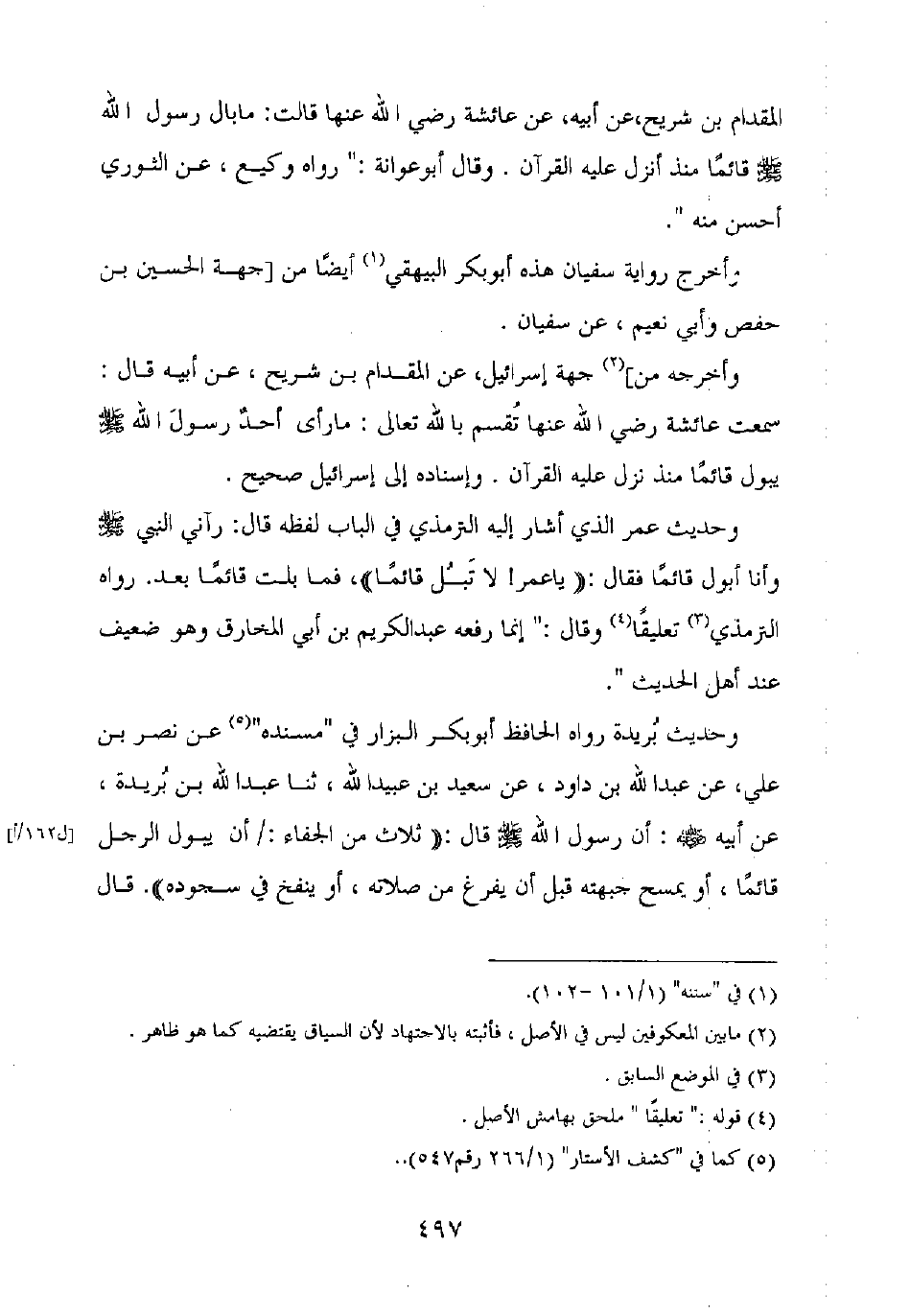 المقدام بن شريح، عن أبيه، عن عائشة رضي الله عنها قالت: ما بال رسول الله صلى الله عليه وسلم قائما منذ أنزل عليه القرآن. وقال أبو عوانة: "رواه وكيع، عن الثوري أحسن منه".