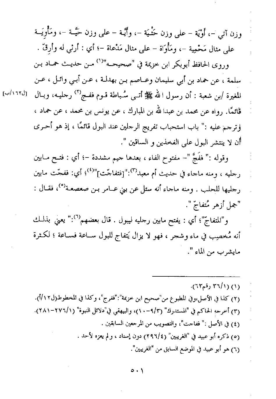 وروى الحافظ أبو بكر بن خزيمة في "صحيحه" من حديث حماد بن سلمة، عن حماد بن أبي سليمان وعاصم بن بهدلة، عن أبي وائل، عن المغيرة بن شعبة: أن رسول الله صلى الله عليه وسلم أتى سباطة قوم ففج رجليه، وبال قائما. رواه عن محمد بن عبد الله بن المبارك، عن يونس بن محمد، عن حماد، وترجم عليه: "باب استحباب تفريج الرجلين عند البول قائما، إذ هو أحرى أن لا ينتشر البول على الفخذين والساقين".