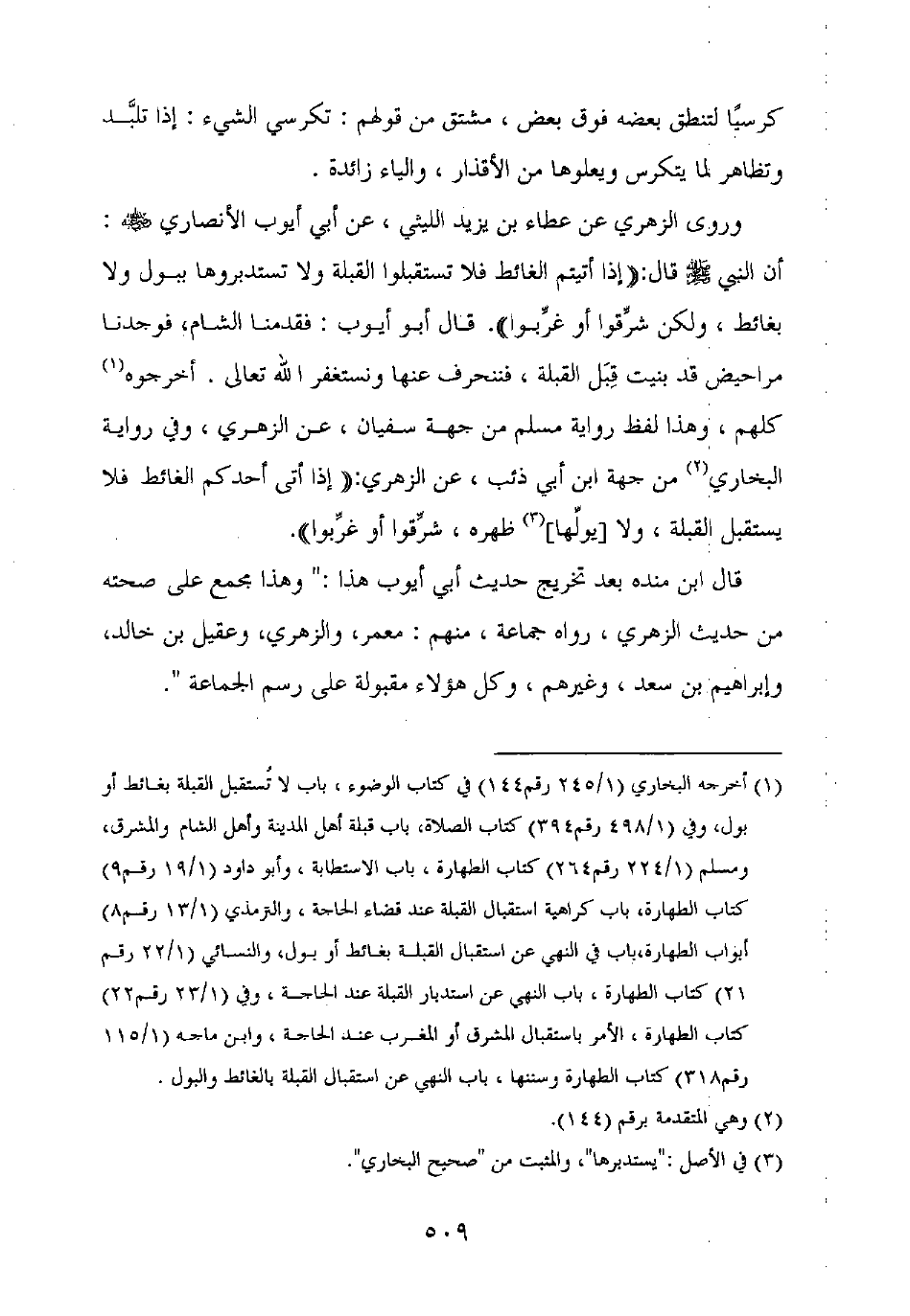 وروى الزهري عن عطاء بن يزيد الليثي، عن أبي أيوب الأنصاري رضي الله عنه: أن النبي صلى الله عليه وسلم قال: "إذا أتيتم الغائط فلا تستقبلوا القبلة ولا تستدبروها ببول ولا بغائط، ولكن شرقوا أو غربوا". قال أبو أيوب: فقدمنا الشام، فوجدنا مراحيض قد بنيت قبل القبلة، فننحرف عنها ونستغفر الله تعالى. أخرجوه كلهم، وهذا لفظ رواية مسلم من جهة سفيان، عن الزهري، وفي رواية البخاري من جهة ابن أبي ذئب، عن الزهري: "إذا أتى أحدكم الغائط فلا يستقبل القبلة، ولا [يولها] ظهره، شرقوا أو غربوا".