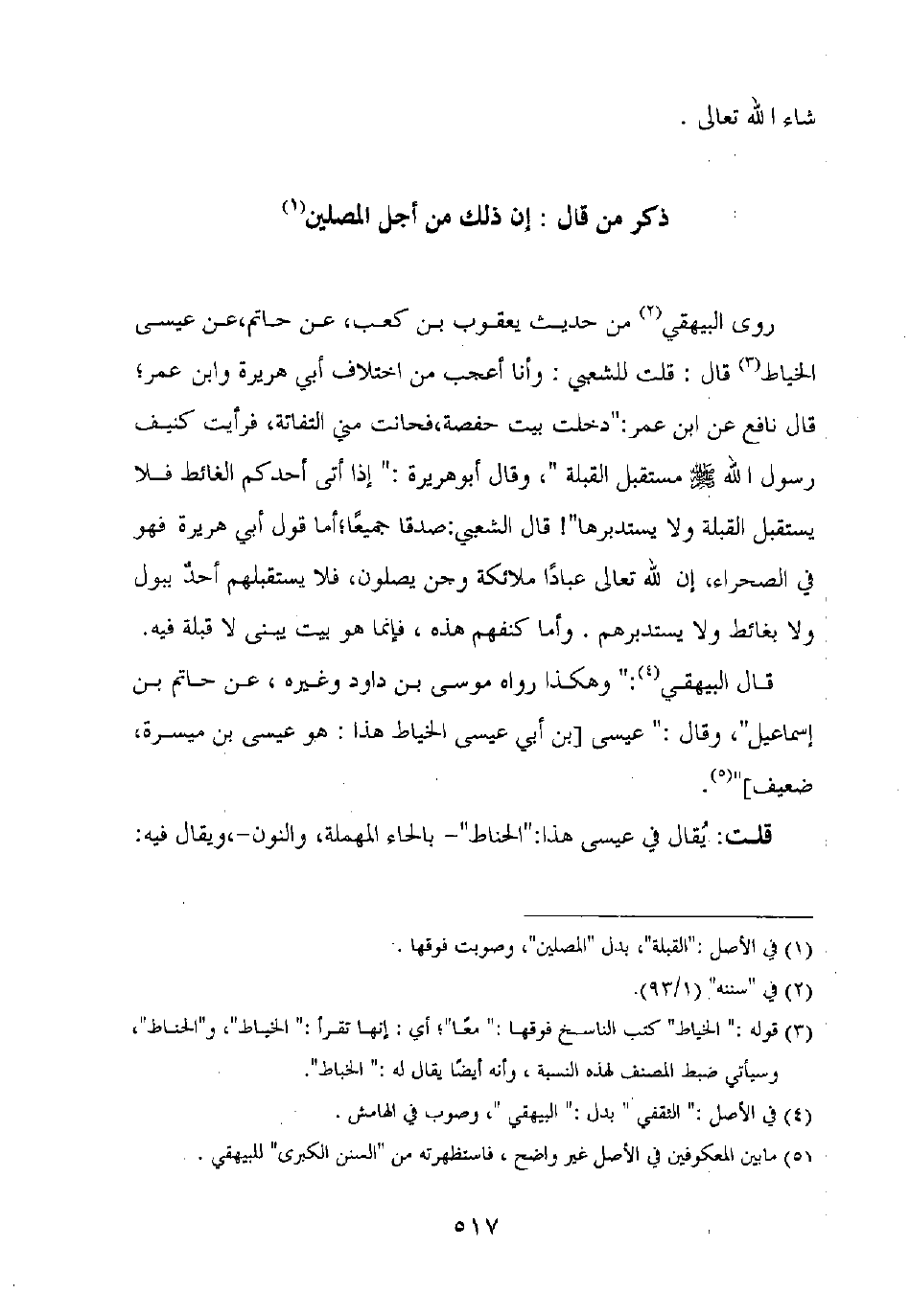 روى البيهقي من حديث يعقوب بن كعب، عن حاتم، عن عيسى الخياط قال: قلت للشعبي: وأنا أعجب من اختلاف أبي هريرة وابن عمر، قال نافع عن ابن عمر: "دخلت بيت حفصة، فحانت مني التفاتة، فرأيت كنيف رسول الله صلى الله عليه وسلم مستقبل القبلة"، وقال أبو هريرة: "إذا أتى أحدكم الغائط فلا يستقبل القبلة ولا يستدبرها"! قال الشعبي: صدقا جميعا، أما قول أبي هريرة فهو في الصحراء، إن لله تعالى عبادا ملائكة وجن يصلون، فلا يستقبلهم أحد ببول ولا بغائط ولا يستدبرهم. وأما كنفهم هذه، فإنما هو بيت يبنى لا قبلة فيه.