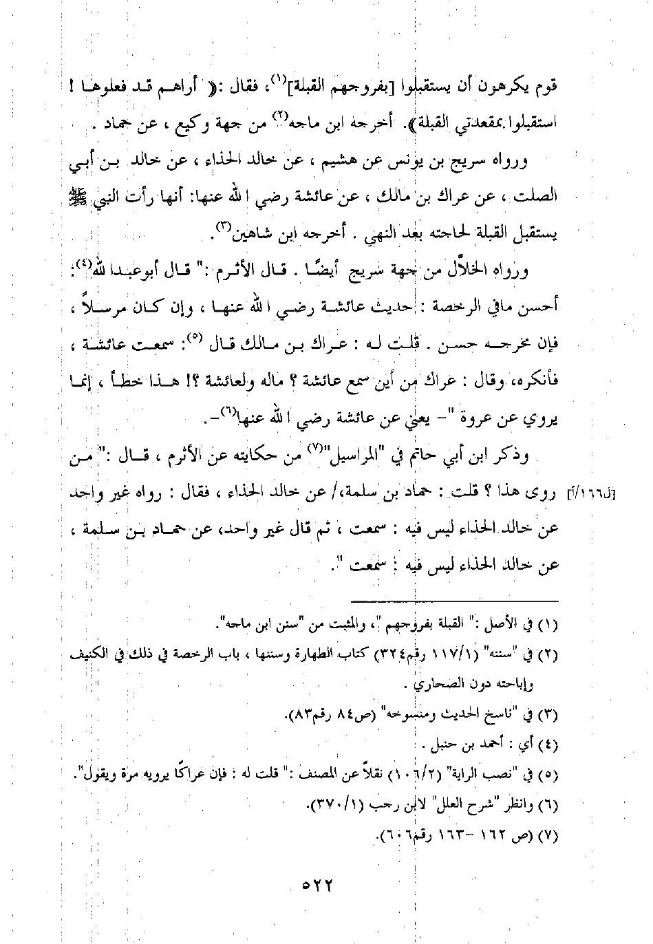 ورواه سريج بن يونس عن هشيم، عن خالد الحذاء، عن خالد بن أبي الصلت، عن عراك بن مالك، عن عائشة رضي الله عنها: أنها رأت النبي صلى الله عليه وسلم يستقبل القبلة لحاجته بعد النهي. أخرجه ابن شاهين.