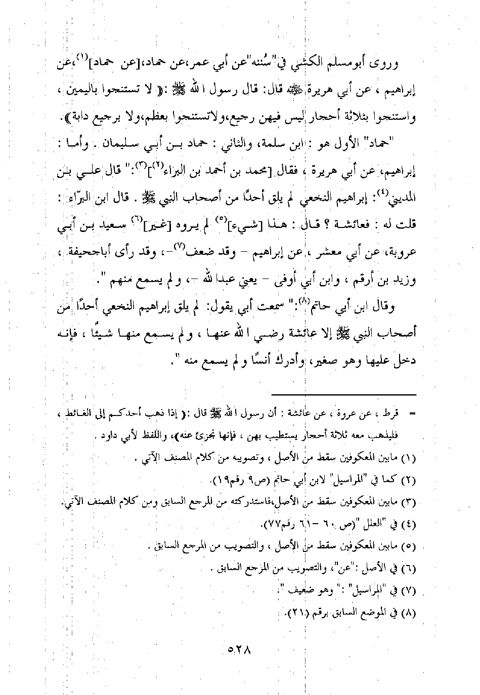 "حماد" الأول هو: ابن سلمة، والثاني: حماد بن أبي سليمان. وأما: إبراهيم، عن أبي هريرة، فقال [محمد بن أحمد بن البراء]: "قال علي بن المديني: إبراهيم النخعي لم يلق أحدا من أصحاب النبي صلى الله عليه وسلم. قال ابن البراء: قلت له: فعائشة؟ قال: هذا [شيء] لم يروه [غير] سعيد بن أبي عروبة، عن أبي معشر، عن إبراهيم – وقد ضعف –، وقد رأى أبا جحيفة، وزيد بن أرقم، وابن أبي أوفى – يعني عبد الله –، ولم يسمع منهم".