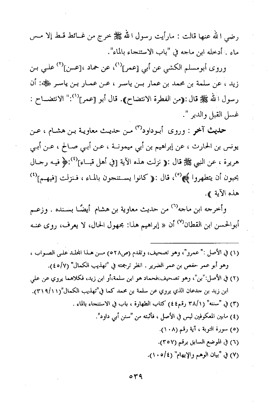 حديث آخر: وروى أبو داود من حديث معاوية بن هشام، عن يونس بن الحارث، عن إبراهيم بن أبي ميمونة، عن أبي صالح، عن أبي هريرة، عن النبي صلى الله عليه وسلم قال: "نزلت هذه الاية [في أهل قباء]: {فيه رجال يحبون أن يتطهروا}، قال: "كانوا يستنجون بالماء، فنزلت [فيهم] هذه الآية".