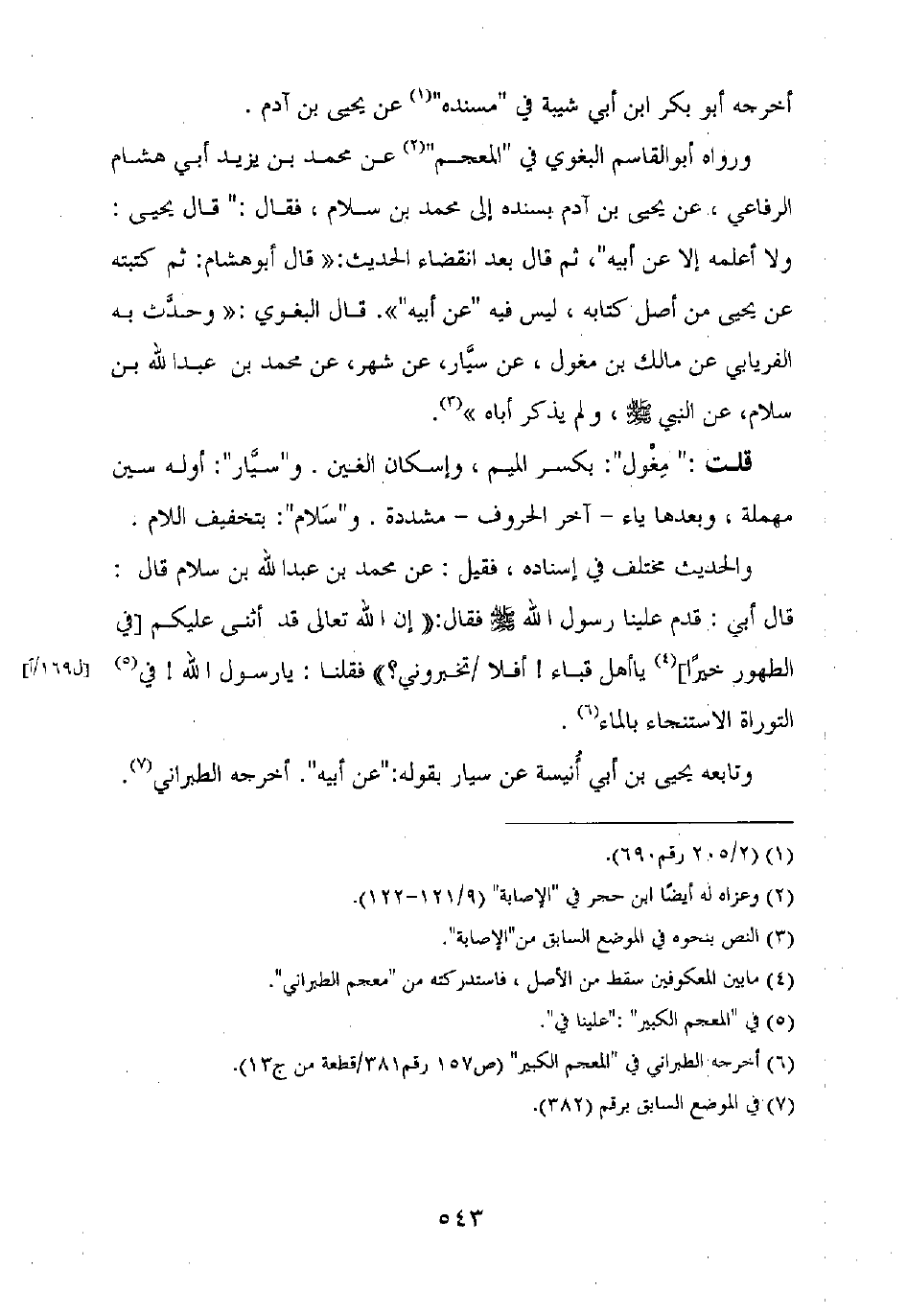 ورواه أبو القاسم البغوي في "المعجم" عن محمد بن يزيد أبي هشام الرفاعي، عن يحيى بن آدم بسنده إلى محمد بن سلام، فقال: "قال يحيى: ولا أعلمه إلا عن أبيه"، ثم قال بعد انقضاء الحديث: "قال أبو هشام: ثم كتبته عن يحيى من أصل كتابه، ليس فيه "عن أبيه" ". قال البغوي: "وحدث به الفريابي عن مالك بن مغول، عن سيار، عن شهر، عن محمد بن عبد الله بن سلام، عن النبي صلى الله عليه وسلم، ولم يذكر أباه ".
