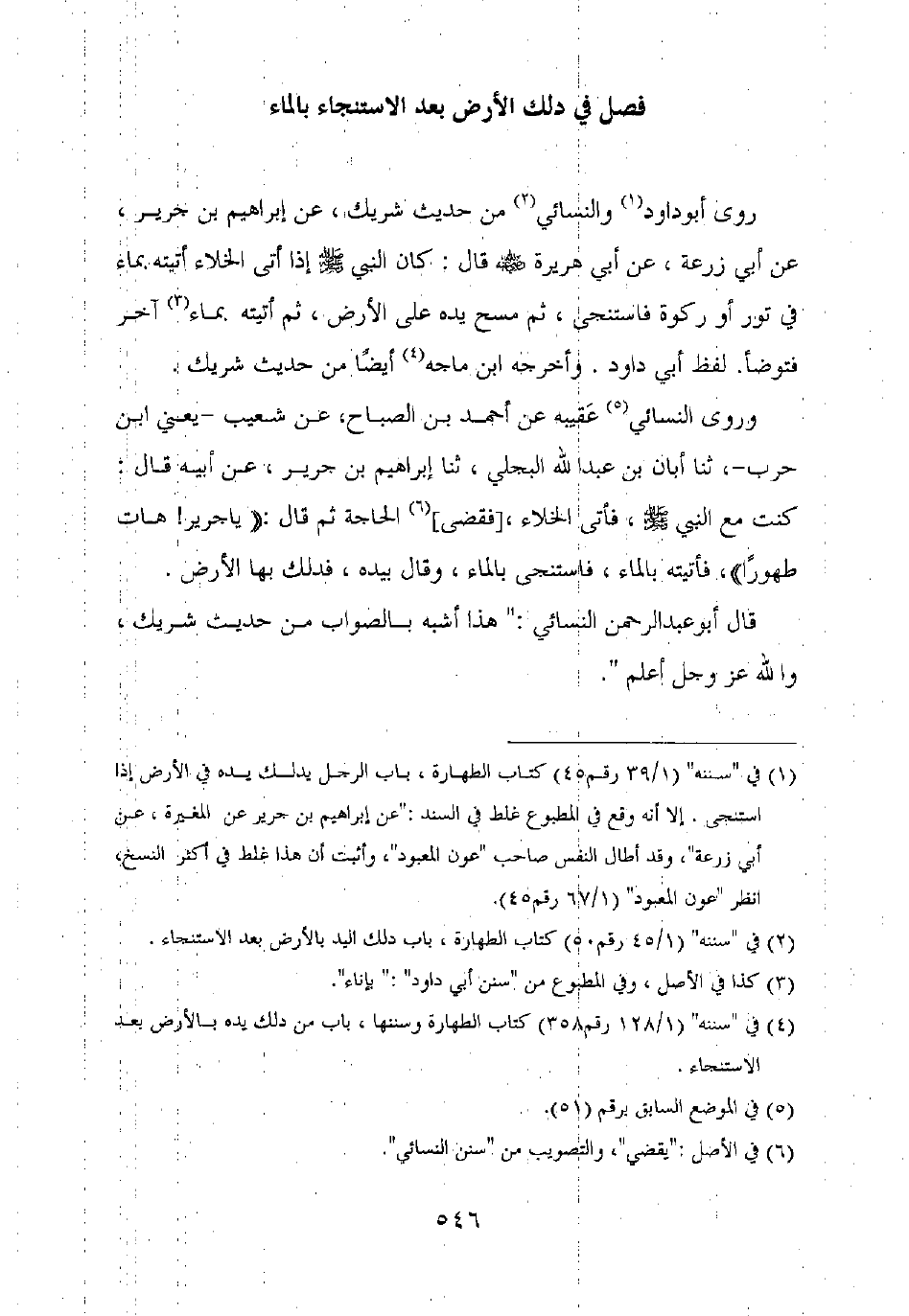 وروى النسائي عقيبه عن أحمد بن الصباح، عن شعيب – يعني ابن حرب –، ثنا أبان بن عبد الله البجلي، ثنا إبراهيم بن جرير، عن أبيه قال: كنت مع النبي صلى الله عليه وسلم، فأتى الخلاء، [فقضى] الحاجة ثم قال: "يا جرير! هات طهورا"، فأتيته بالماء، فاستنجى بالماء، وقال بيده، فدلك بها الأرض.