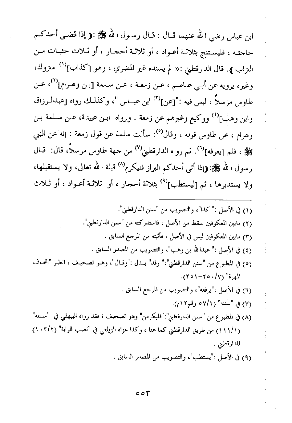 ابن عباس رضي الله عنهما قال: قال رسول الله صلى الله عليه وسلم: "إذا قضى أحدكم حاجته، فليستنج بثلاثة أعواد، أو ثلاثة أحجار، أو ثلاث حثيات من التراب". قال الدارقطني: "لم يسنده غير المضري، وهو [كذاب] متروك، وغيره يرويه عن أبي عاصم، عن زمعة، عن سلمة [بن وهرام]، عن طاوس مرسلا، ليس فيه: " [عن] ابن عباس"، وكذلك رواه [عبد الرزاق وابن وهب] ووكيع وغيرهم عن زمعة. ورواه ابن عيينة، عن سلمة بن وهرام، عن طاوس قوله، وقال: سألت سلمة عن قول زمعة: إنه عن النبي صلى الله عليه وسلم، فلم [يعرفه]. ثم رواه الدارقطني من جهة طاوس مرسلا، قال: قال رسول الله صلى الله عليه وسلم: "إذا أتى أحدكم البراز فليكرم قبلة الله تعالى، ولا يستقبلها، ولا يستدبرها، ثم [ليستطب] بثلاثة أحجار، أو ثلاثة أعواد، أو ثلاث