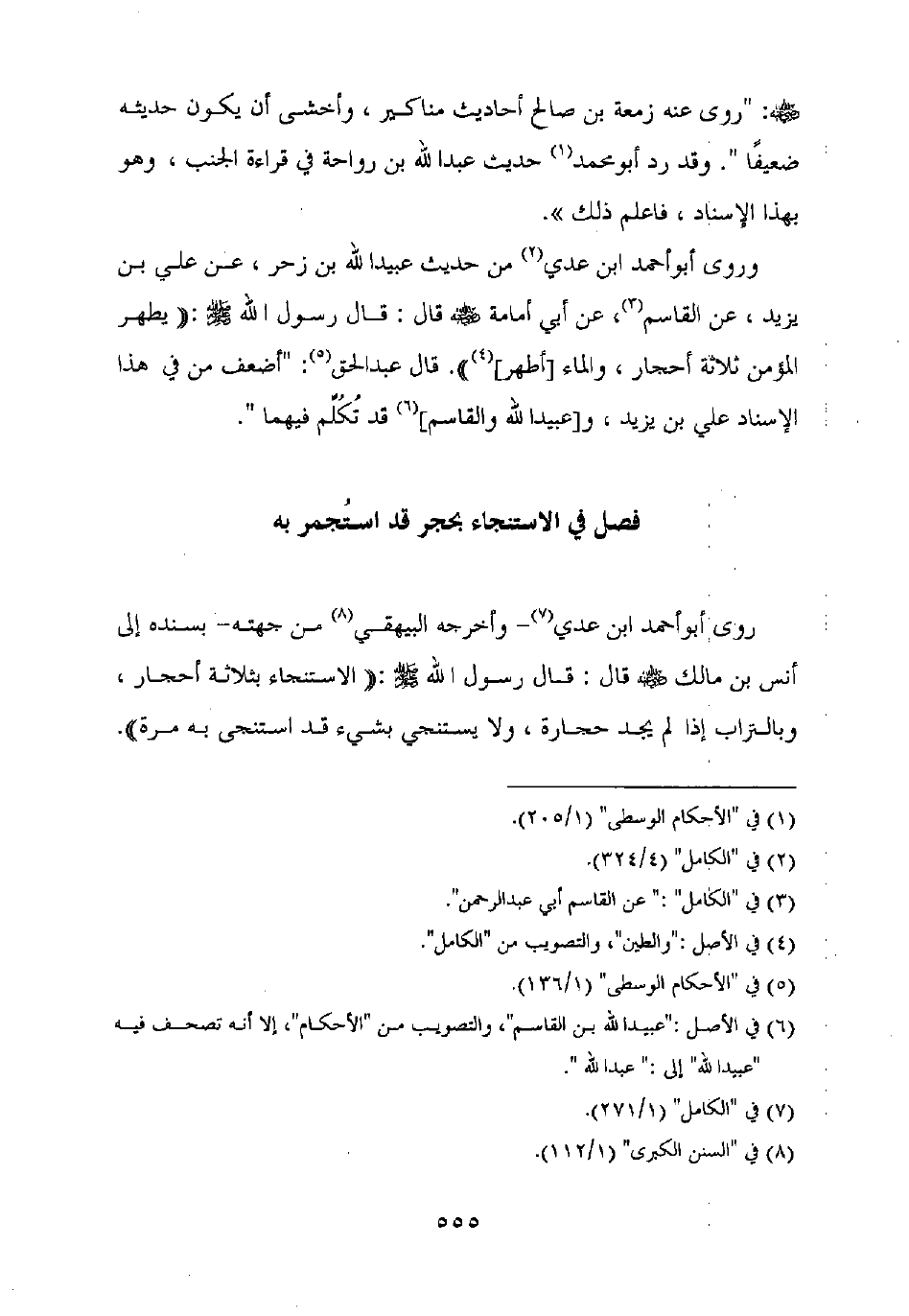 وروى أبو أحمد ابن عدي من حديث عبيد الله بن زحر، عن علي بن يزيد، عن القاسم، عن أبي أمامة رضي الله عنه قال: قال رسول الله صلى الله عليه وسلم: "يطهر المؤمن ثلاثة أحجار، والماء [أطهر] ". قال عبد الحق: "أضعف من في هذا الإسناد علي بن يزيد، و [عبيد الله والقاسم] قد تكلم فيهما".