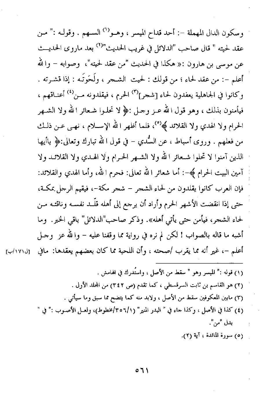 وروى أسباط عن السدي في قول الله تبارك وتعالى: {يا أيها الذين آمنوا لا تحلوا شعائر الله ولا الشهر الحرام ولا الهدي ولا القلائد ولا آمين البيت الحرام} أما شعائر الله تعالى: فحرم الله، وأما الهدي والقلائد: فإن العرب كانوا يقلدون من لحاء الشجر – شجر مكة –، فيقيم الرجل بمكة، حتى إذا انقضت الأشهر الحرم وأراد أن يرجع إلى أهله قلد نفسه وناقته من لحاء الشجر، فيأمن حتى يأتي أهله". وذكر صاحب "الدلائل" باقي الخير. وما أشبه ما قاله بالصواب! لكن لم نره في رواية مما وقفنا عليه – والله عز وجل أعلم –، غير أنه مما يقرب صحته، وأن اللحية مما كان بعضهم يعقدها: ما في