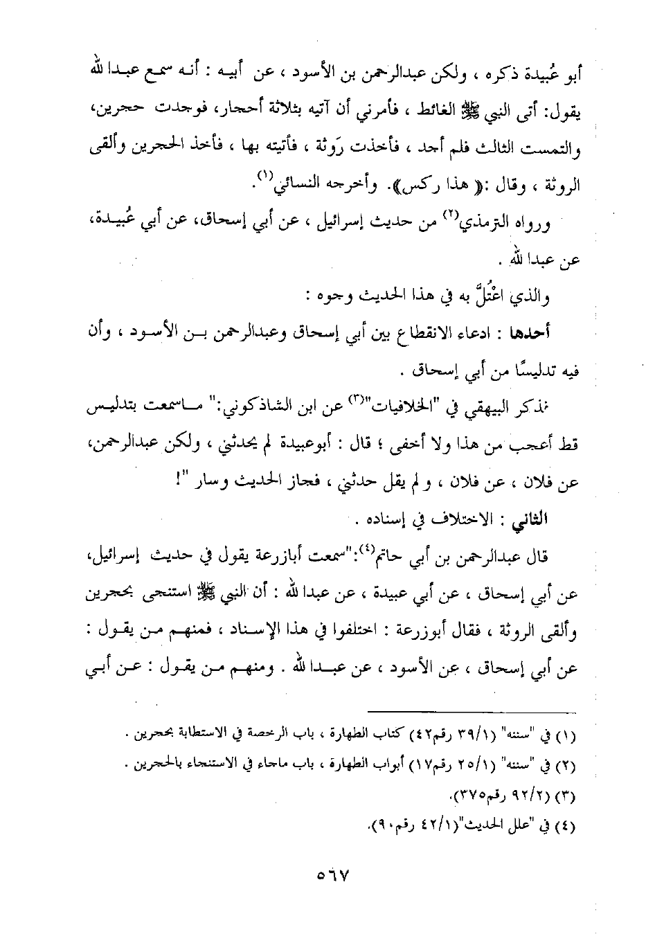 قال عبد الرحمن بن أبي حاتم: "سمعت أبا زرعة يقول في حديث إسرائيل، عن أبي إسحاق، عن أبي عبيدة، عن عبد الله: أن النبي صلى الله عليه وسلم استنجى بحجرين وألقى الروثة، فقال أبو زرعة: اختلفوا في هذا الإسناد، فمنهم من يقول: عن أبي إسحاق، عن الأسود، عن عبد الله. ومنهم من يقول: عن أبي