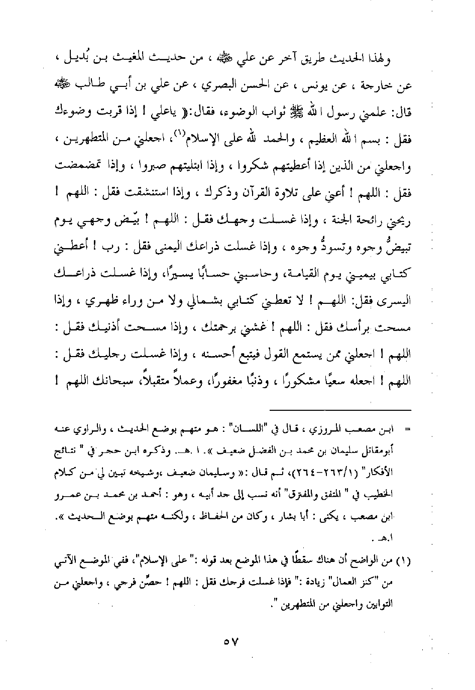 ولهذا الحديث طريق آخر عن علي رضي الله عنه، من حديث المغيث بن بديل، عن خارجة، عن يونس، عن الحسن البصري، عن علي بن أبي طالب رضي الله عنه قال: علمني رسول الله صلى الله عليه وسلم ثواب الوضوء، فقال: "يا علي! إذا قربت وضوءك فقل: بسم الله العظيم، والحمد لله على الإسلام، اجعلني من المتطهرين، واجعلني من الذين إذا أعطيتهم شكروا، وإذا ابتليتهم صبروا، وإذا تمضمضت فقل: اللهم! أعني على تلاوة القرآن وذكرك، وإذا استنشقت فقل: اللهم! ريحني رائحة الجنة، وإذا غسلت وجهك فقل: اللهم! بيض وجهي يوم تبيض وجوه وتسود وجوه، وإذا غسلت ذراعك اليمنى فقل: رب! أعطني كتابي بميني يوم القيامة، وحاسبني حسابا يسيرا، وإذا غسلت ذراعك اليسرى فقل: اللهم! لا تعطني كتابي بشمالي ولا من وراء ظهري، وإذا مسحت برأسك فقل: اللهم! غشني برحمتك، وإذا مسحت أذنيك فقل: اللهم! اجعلني ممن يستمع القول فيتبع أحسنه، وإذا غسلت رجليك فقل: اللهم! اجعله سعيا مشكورا، وذنبا مغفورا، وعملا متقبلا، سبحانك اللهم!